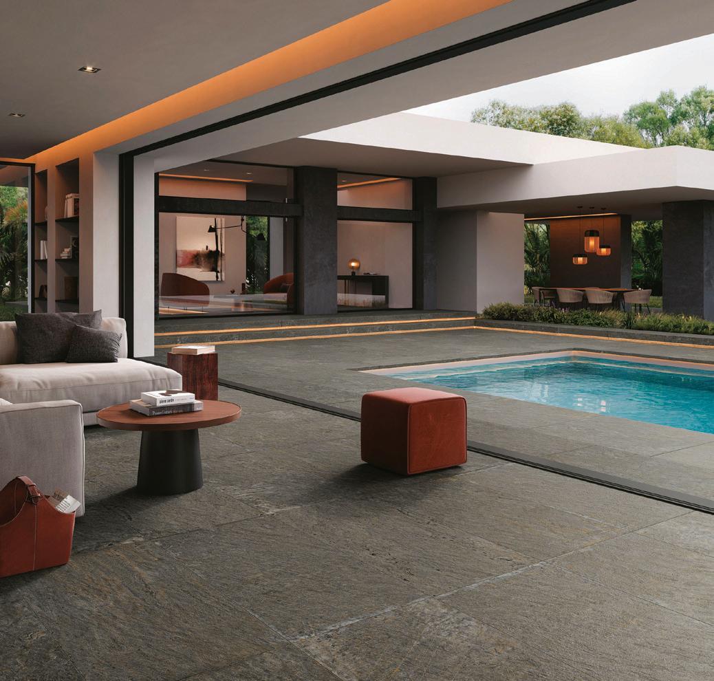 Monolithique. Cove chez Boffi expose les lignes architecturales de Zaha Hadid Design. La géométrie simple et sinueuse, le plein et le vide, le Corian et le bois délimitent la cuisine sans briser son aspect monobloc. boffi.com/fr Métamorphose. Blade Lab est né de la recherche et des nouvelles technologies. Modulnova a apporté du raffinement à un matériau notoirement lourd, la pierre naturelle Amarula Raw. Armoires en bois d’eucalyptus. modulnova.com/fr