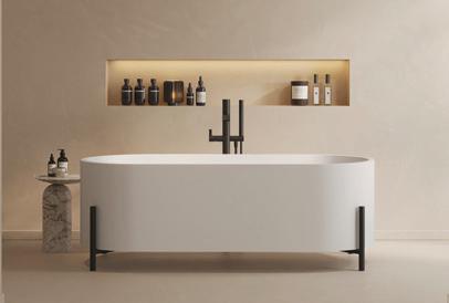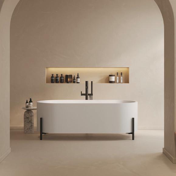Des pieds tubulaires fins confèrent un aspect à la fois élégant et moderne à Milano, une baignoire îlot disponible chez Riluxa. En Solid Surface. Sans tablier. riluxa.com/fr