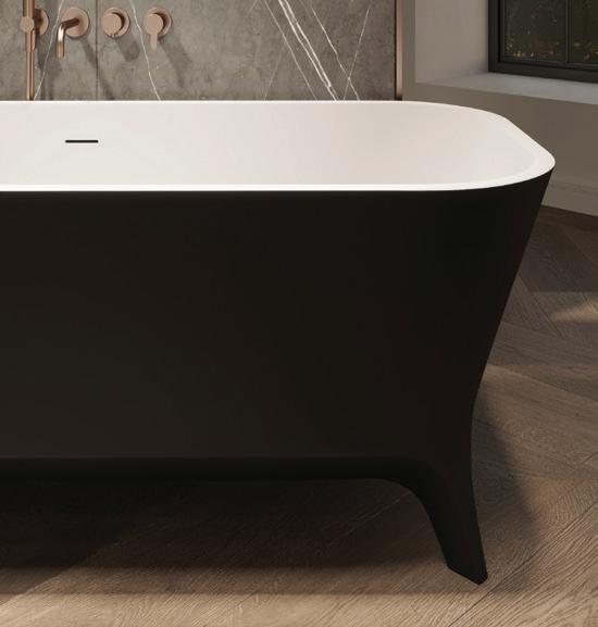 Riluxa présente Miram, une élégante baignoire îlot noire et blanche. Composition : Solid Surface, une matière dure, hygiénique et non poreuse. Existe en blanc, gris et champagne.