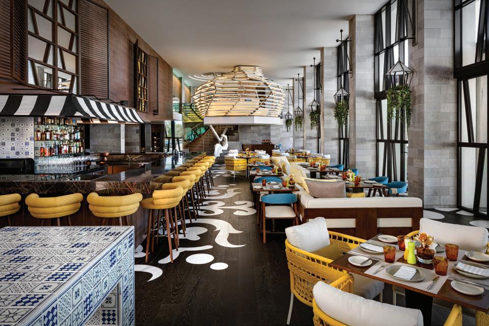 Au sommet de l’hôtel, le restaurant Paper Moon revêt un intérieur monochrome créé à partir d’un bois blanchi et de sols clairs.
