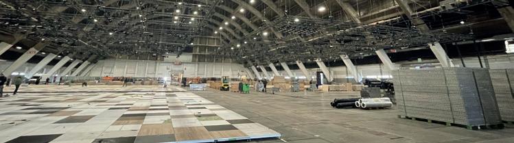 Ensuite, c’est à chaque exposant de faire intervenir ses sous-traitants. Lors des premiers jours de montage, ce sont surtout les structures aériennes qui vont supporter l’éclairage qui sont installées, ainsi que les sols. Des semi-remorques entières de panneaux en bois pénètrent sur le site via la Chaussée Romaine après avoir montré patte blanche à la porte G.