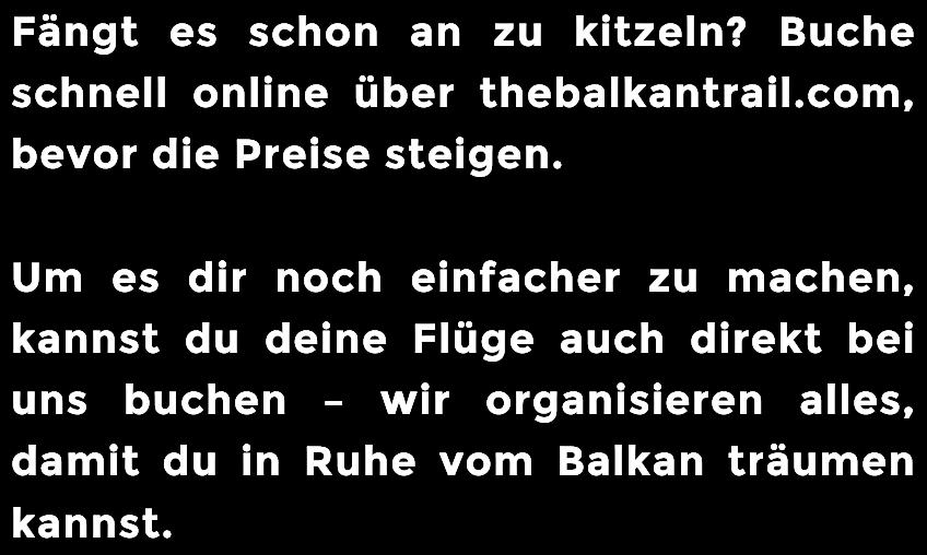 Im Kapitel „Optionen & Extras“ findest du alle Preise, die in der ersten Buchungswoche gültig sind. Danach können sich die Preise je nach Verfügbarkeit erhöhen. Buchungen für dieses Abenteuer erfolgen online über www.thebalkantrail.com