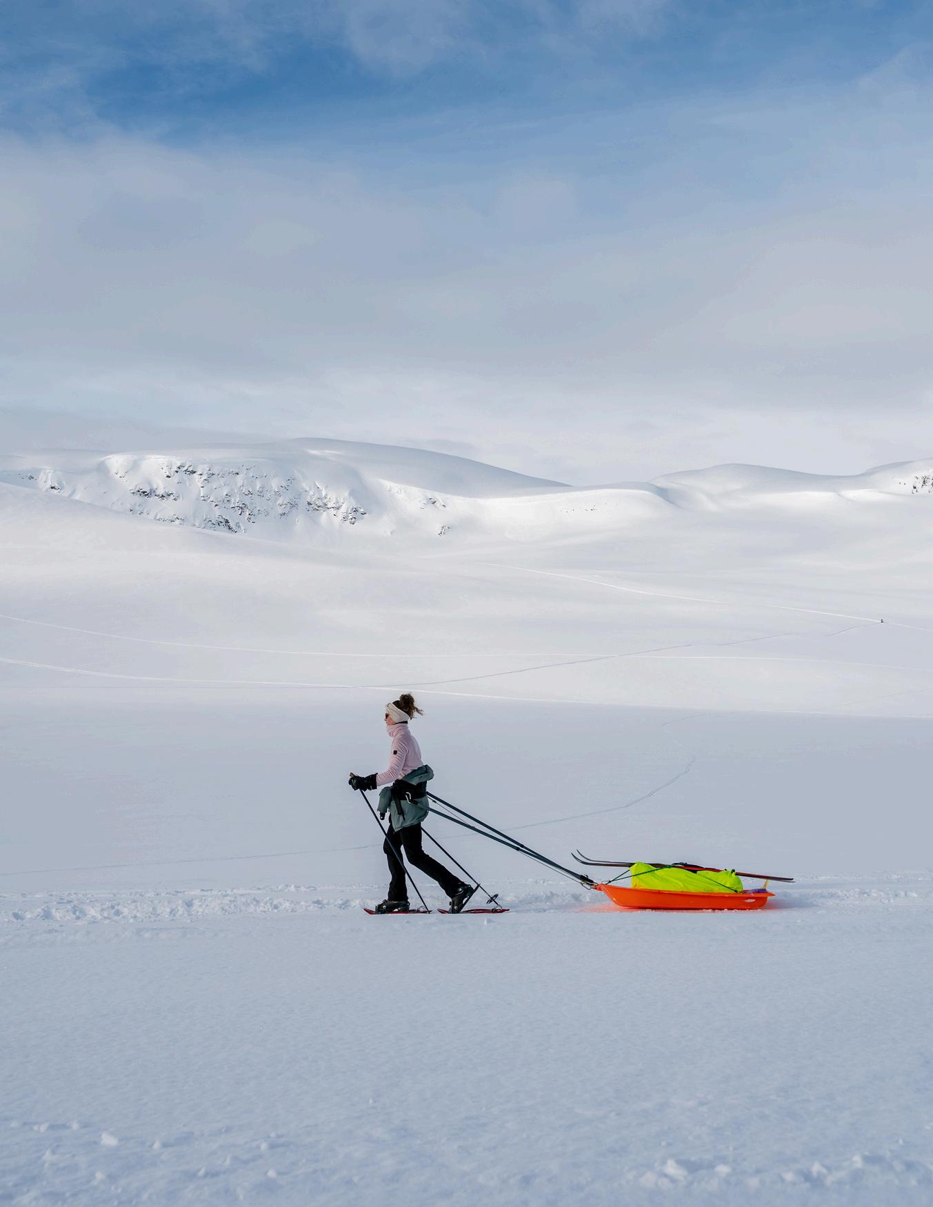 Een pulka is een slede waarin je je spullen opbergt Met behulp van twee stangen en een heupband trek je de slede voort vanuit je heupen. Deze speciaal ontworpen sledes glijden vlot door diepe sneeuw, waardoor je geen gewicht op je rug draagt maar achter je meesleept – wat in dit terrein vaak een stuk comfortabeler aanvoelt