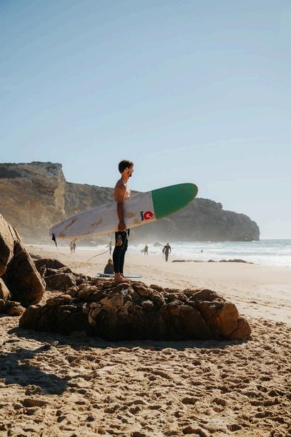 The next morning, you have the option to participate in a surf lesson. Not a fan of surfing? No problem! Near Arrifana lies one of the most beautiful sections of the Fisherman's Trail, a trail located along Portugal's coastline The hike from Pontal da Carrapateira to Praia de Amado and back takes you past breathtaking views After an active day, you'll drive in about an hour from Arrifana to the charming coastal village of Salema, where you'll stay at an idyllic eco camp.