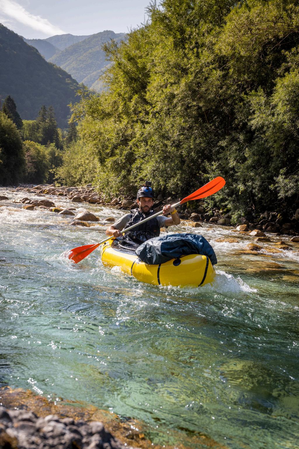 Packraft, Paddel, aufblasbare Tasche, Regenrock und Schwimmweste