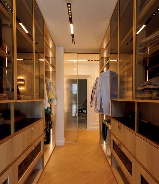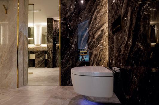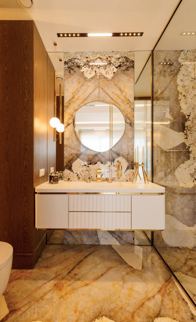 Doskonałym na to przykładem jest wystrój sypialni głównej w aranżacji wykonanej przy użyciu wysokiej jakości selekcjonowanego drewna orzecha amerykańskiego, a także rzadkiego egzotycznego kwarcytu o licznych prześwitach w feerii delikatnych odcieni beżu. Łącząc się ze srebrnymi i czarnymi minerałami, tworzy on wyjątkowe rysunki użylenia, na których tle świetnie prezentuje się najwyższej jakości armatura i wyposażenie, takie jak wanna projektu Zahy Hadid. Swoje miejsce znalazła ona we wnętrzu sypialni, oddzielonej od łazienki ornamentową kryształową ścianą przesuwną.