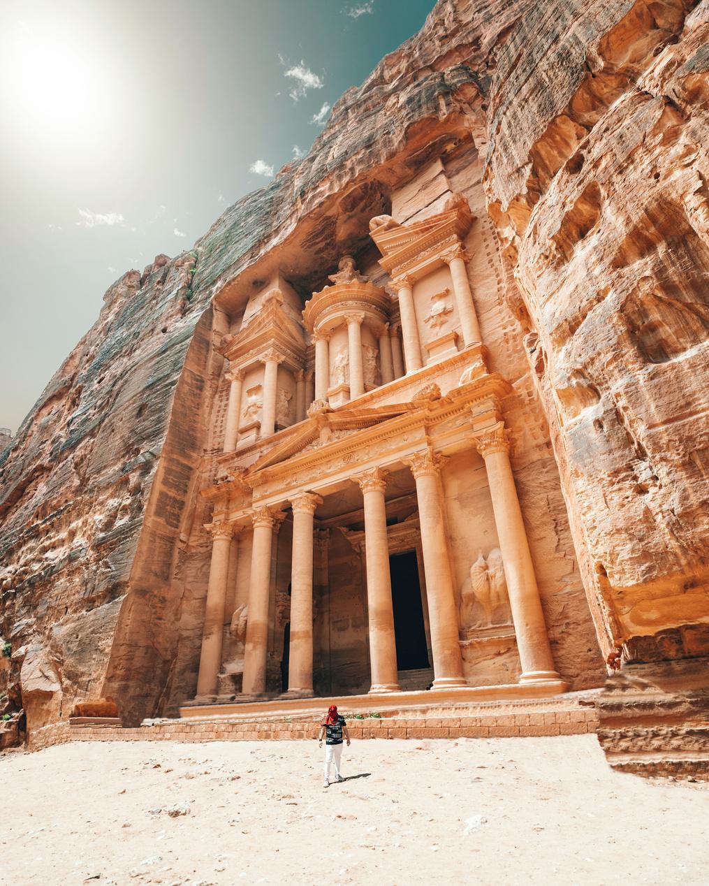 Indudablemente la atracción más conocida de Jordania, Petra “la Ciudad Rosa” es la antigua capital del reino nabateo. Nombrada Patrimonio de la Humanidad por la UNESCO y una de las 7 Maravillas del Mundo Moderno, es una ciudad excavada en piedra que sorprende a visitantes de todo el mundo con sus majestuosas tumbas y monumentos creados en los acantilados rojos. De sus muchas magníficas construcciones, la más conocida es “El Tesoro”, con su enorme fachada de 30 metros de ancho por 43 metros de alto.