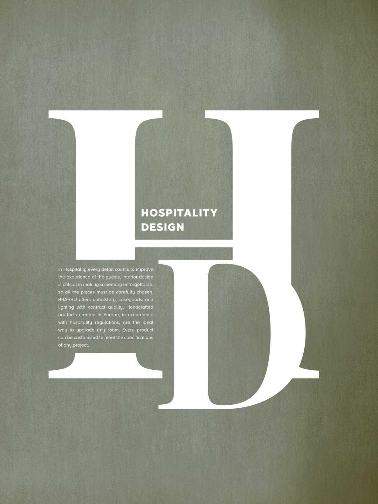 01 Hospitality Design ...........................................................................................................................4 02 Design Craftsmanship, Innovation ...........................................................................................................................6 03 Projects ..........................................................................................................................11 04 Conceptual Living Spaces ........................................................................................................................84 Reception Areas .......................................................................................................................85 Lobbies ......................................................................................................................107 Bar & Lounges ......................................................................................................................123 Restaurants ......................................................................................................................143 Suits ......................................................................................................................163 Bathrooms ......................................................................................................................187 Hallways & Corridors ......................................................................................................................221 Spas ......................................................................................................................239 Offices & Meeting Rooms ......................................................................................................................253 Kids Lounges ......................................................................................................................281 05 Why BRABBU ......................................................................................................................292 BOURBON Dining Chair, AGRA Dining Table by BRABBU. BRUBECK Xl Wall, HANNA Floor by DelightFULL. VENICE Mirror by Boca do Lobo. IMPERIAL SNAKE Rug by Rug’Society.