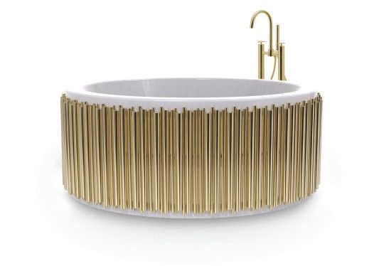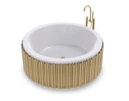 This emotional cylindrical bathtub is inspired by music. The gold-plated brass tubes give the needed touch of luxury, making the Symphony bathtub a piece of elevated design. The tub is made of white fiberglass giving it a clean look perfect for any luxury bathroom.