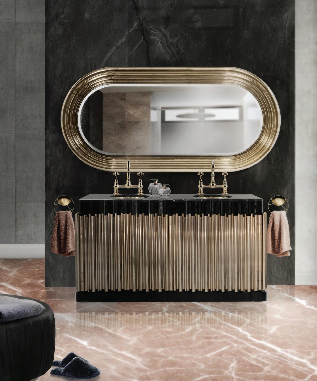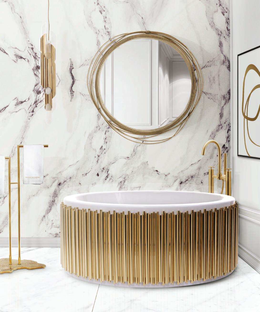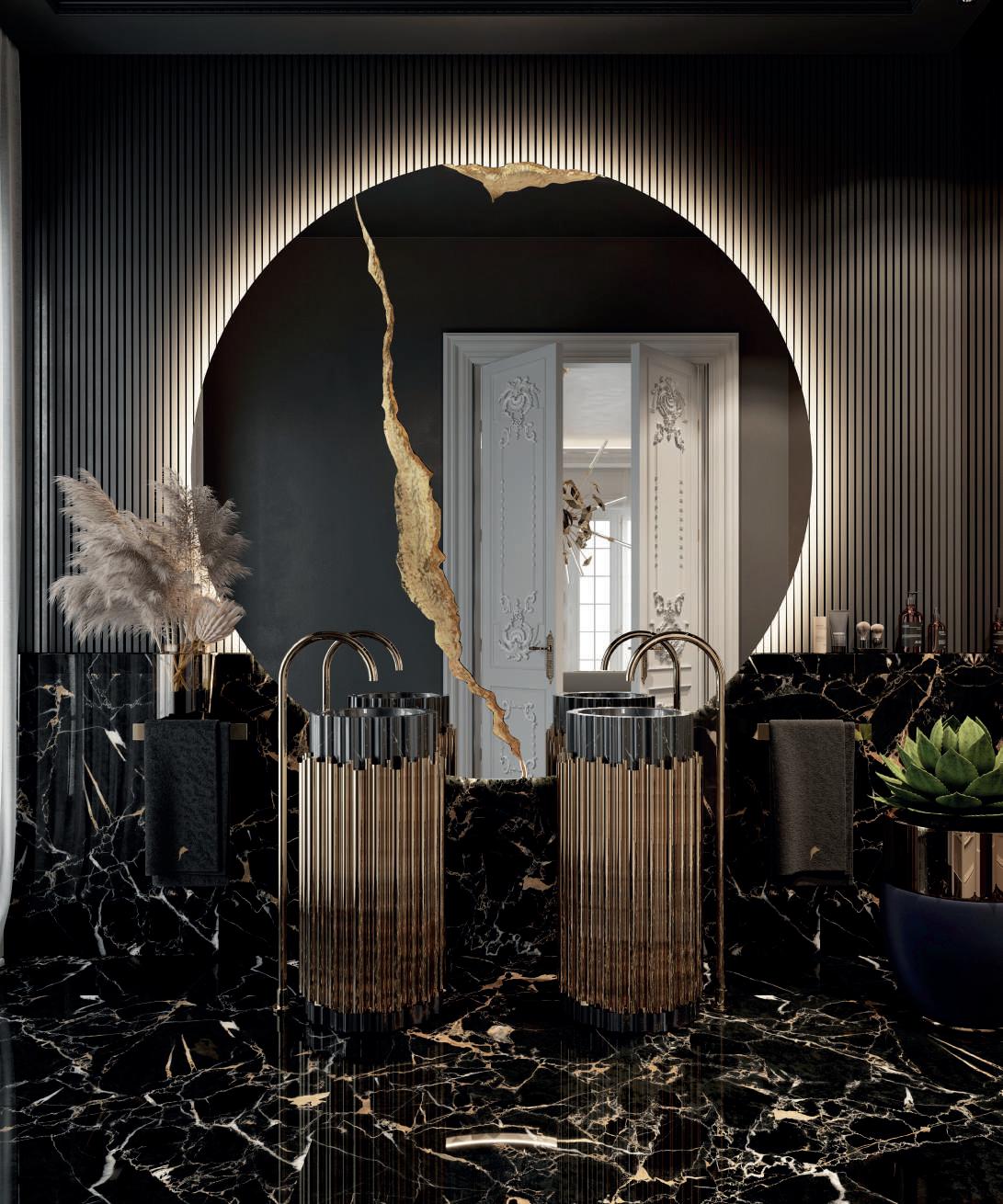 Newton is an outstanding moment of design inspiration. This bathtub features a curved lip style shape, a timeless detail that conveys comfort, made out of gold-painted casted iron, revealing its entire golden interior. The high-gloss black and gold lacquered spheres make the perfect combination to make this a sculptural and artistic piece that will enhance your new Master Bathroom Design.