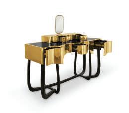 Sinuous is a dressing table designed with a modern and glamorous touch perfect for your bedroom or master bathroom set. Produced in wood, it is covered in black painted with high gloss varnish and polished brass. It offers a wide storage space, with four drawers on the top and five in the bottom, and a mirror accented by a gold-plated rim.