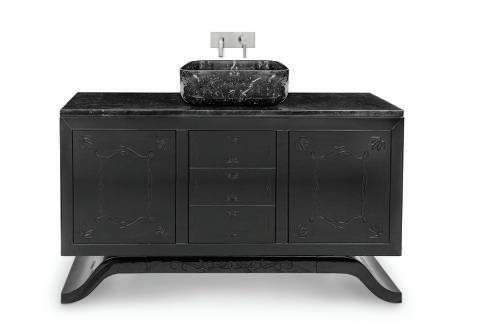 Structure: Wood, Faux-Marble Painting Glossy, options - Sahara Noir, Nero Marquina, Carrara. Base/Inside: Gold leaf; Sink/Cover: Black lacquered glass; Water drainage: Wall.