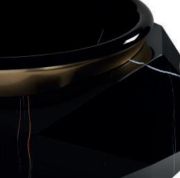 The Diamond freestanding turns heads wherever it stands. It features a wooden structure finished in a faux-marble painting glossy finish, contrasting perfectly with the interior, covered in gold leaf. Besides its irregular shape, it has a built-in oval sink glass with a translucent black finishing.