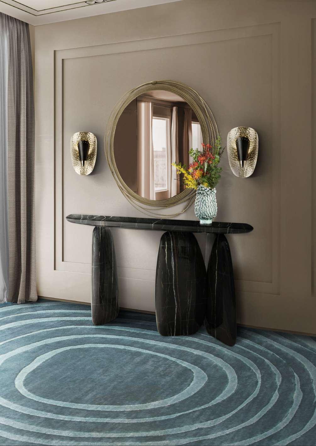 ARDARA II Console, ARUNA Wall Light, KAYAN Mirror by BRABBU and EYE Rug by Rug’Society.