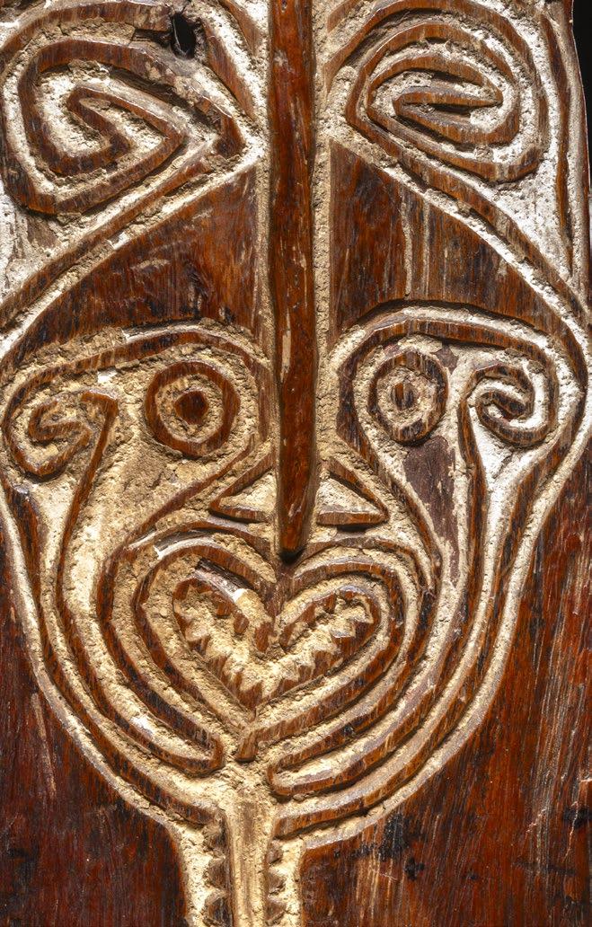 Back in 2011, for my Art of the Boiken catalog, Helen Dennett and I wrote an article on the designs found on the bottom of Boiken plates. At that time, we would have designated the figure on the present plate as being a bird due to the notches on what appear to be wings coming out from the body. Yet the collectors of this piece, Peter and Signe Keller, consider the animal depicted to be a turtle and the face in high relief seems to confirm it. Or as with many New Guinea objects, the creatures depicted are either a combination or in transformation from one into another.