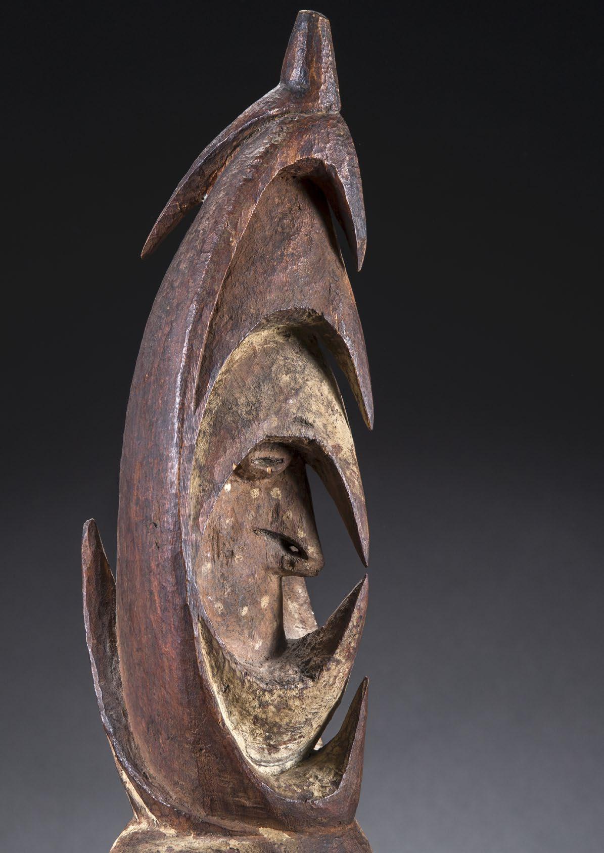 Undoubtedly, a sensitive artist had paid close attention to the smallest details in the overmodeling and further design of the head: a slightly open mouth with confidently shaped lips, a skillful transition into an exquisitely shaped nose, the flow into gently raised eyebrows, masterfully recessed eyes, and finally a perfectly sculpted forehead. The cleverly used twisted locks of human hair and the artfully placed long feather completed the masterpiece of the unknown artist from the middle Sepik region in the most excellent way.