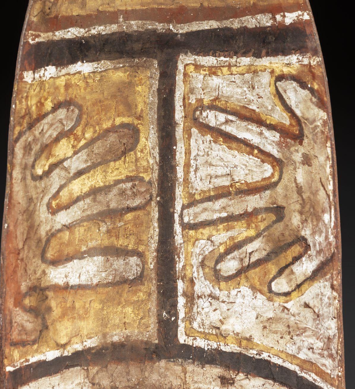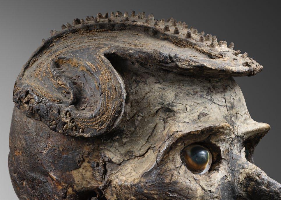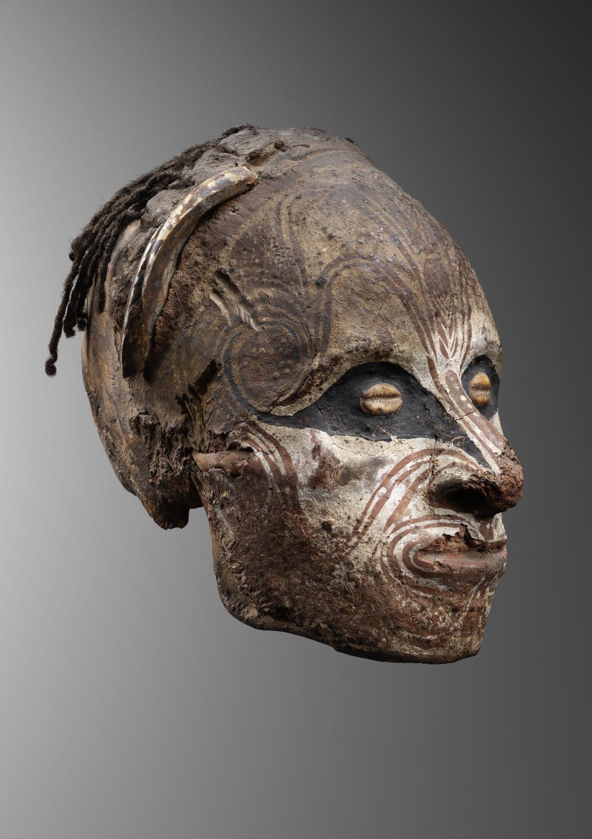 Only a portion of these skulls truly meet this high standard. The one presented here, despite slight damage, is a work of a great artist from the Middle Sepik—both in its realistic overmodeling and its magnificent painting. Based on a very similar skull in the University of Pennsylvania collection with documented provenance, the skull shown here can be attributed to an Iatmul artist from the Middle Sepik.