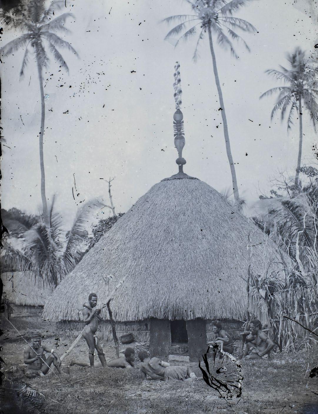 View of gamal (sacred thatched roof building) with large wooden bird bowl and two men photographed by John Watt Beattie circa 1913. British Museum Oc,G.T.1983 © The Trustees of the