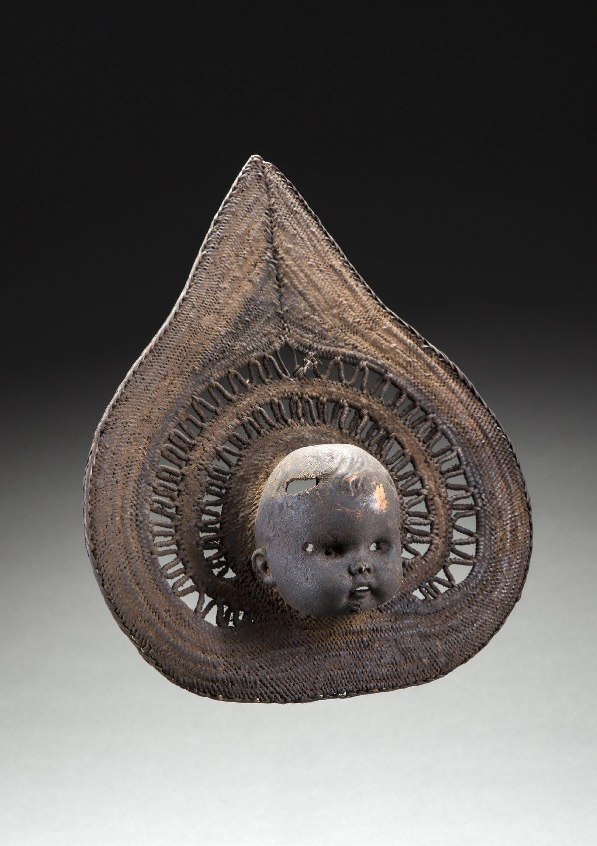 A child’s plastic doll’s face has been ingeniously incorporated into this old and well-used yam mask. The Abelam were admired for the long yams they grew and feared for the magic and spiritual power they brought to the task. When Western pigments and materials became available Abelam artists enthusiastically incorporated them into their ritual objects. The doll’s face would have manifested the power of the outsiders and could bolster the potency of their own magic. The end result is a yam mask with an otherworldly presence made more haunting by the rat-gnawed hole in the skull and blackened patina from decades suspended from the rafters.