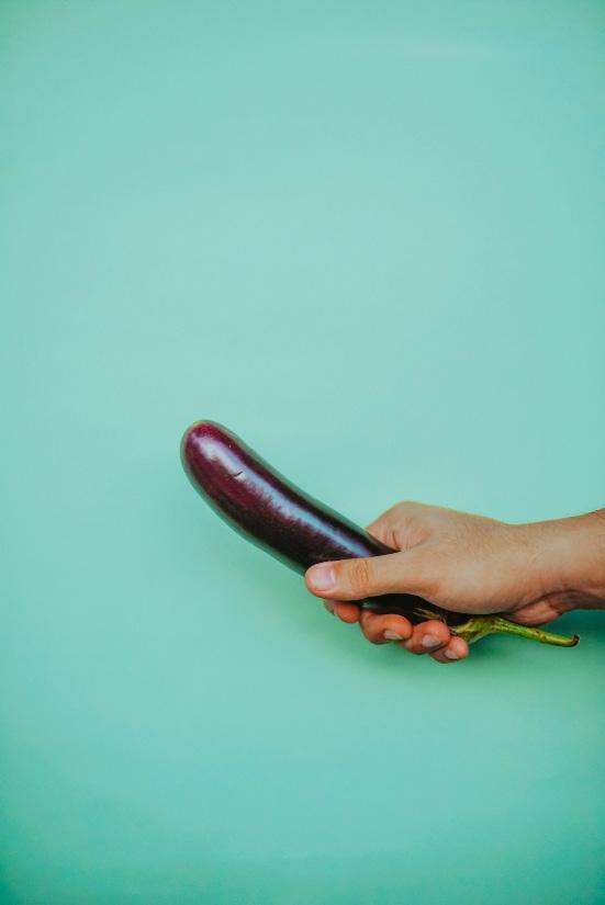 circles, then dicing. Before dicing the circles, hold two of them up to your chest and pretend you have giant nipples, but you don’t really, it’s just an optical illusion (created by the aubergine circles). en dice the onion.