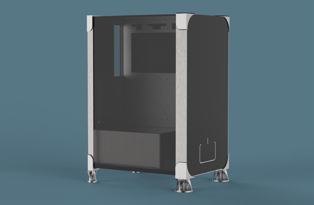 It was created by evaluating computer case designs’ current state and developing techniques that allow for a more user-friendly format. A sliding window and removable ‘build plate’ makes fewer obstacles when building the desktop.