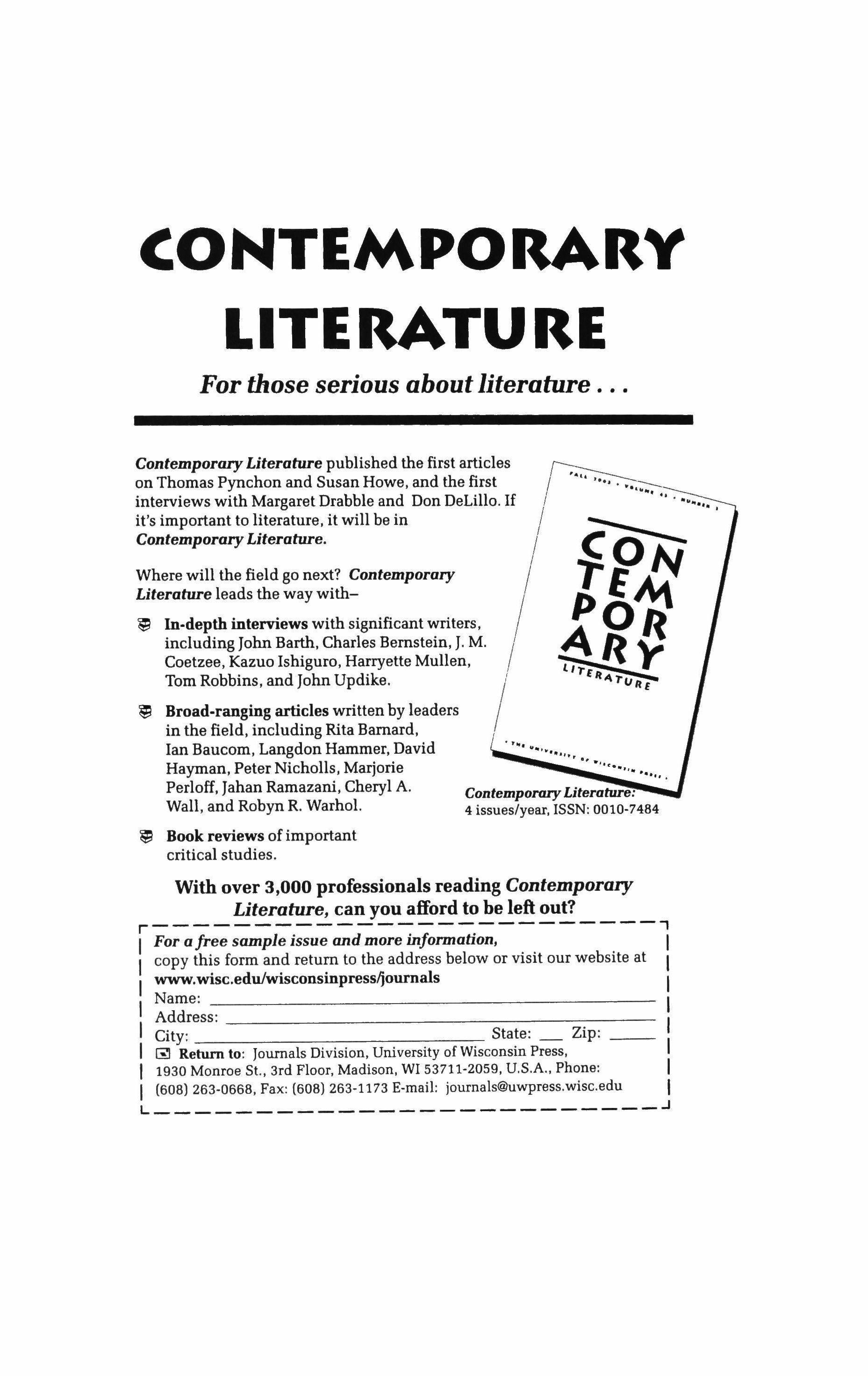 With over 3,000 professionals reading Contemporary Literature, can you afford to be left out?