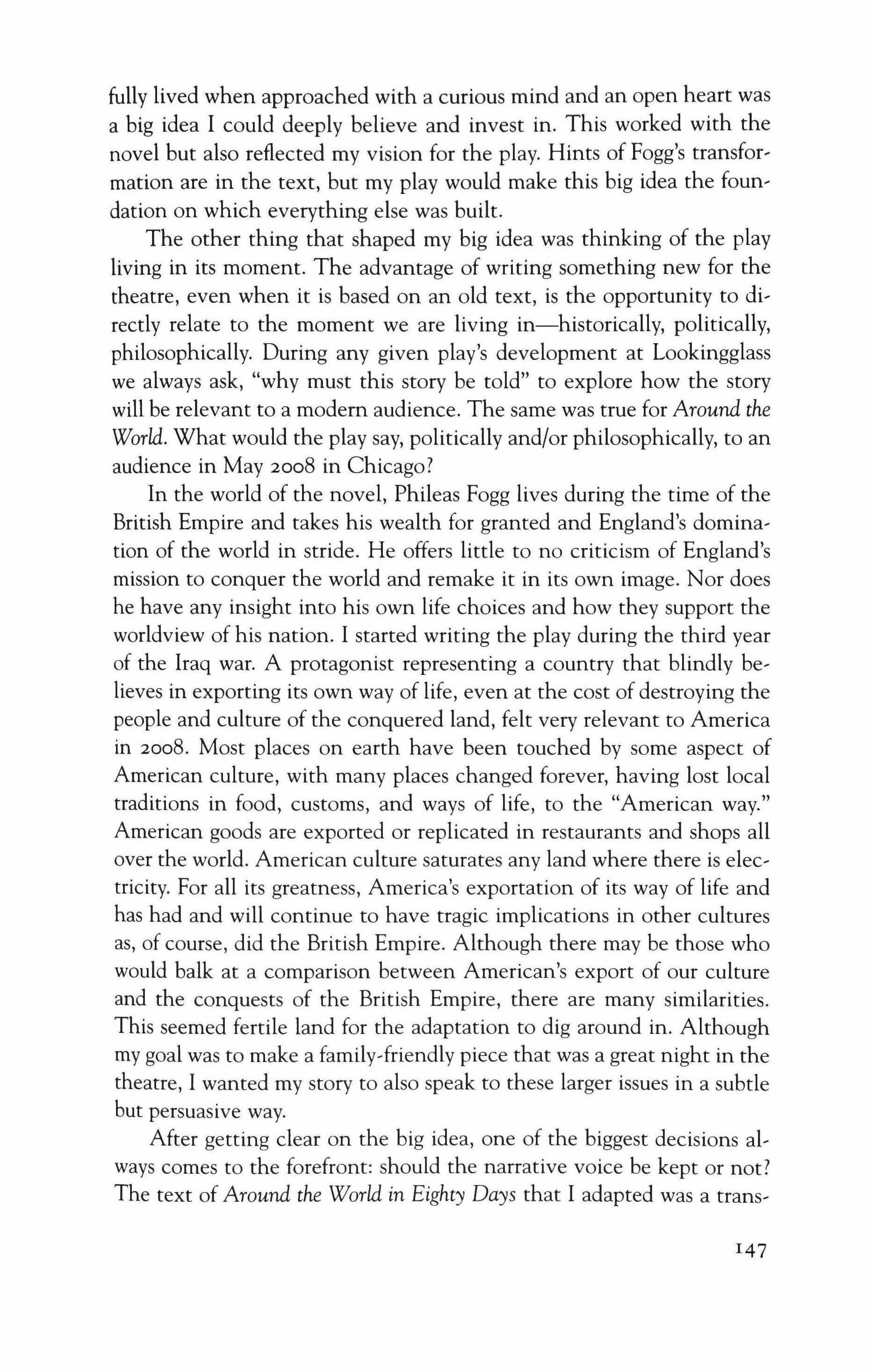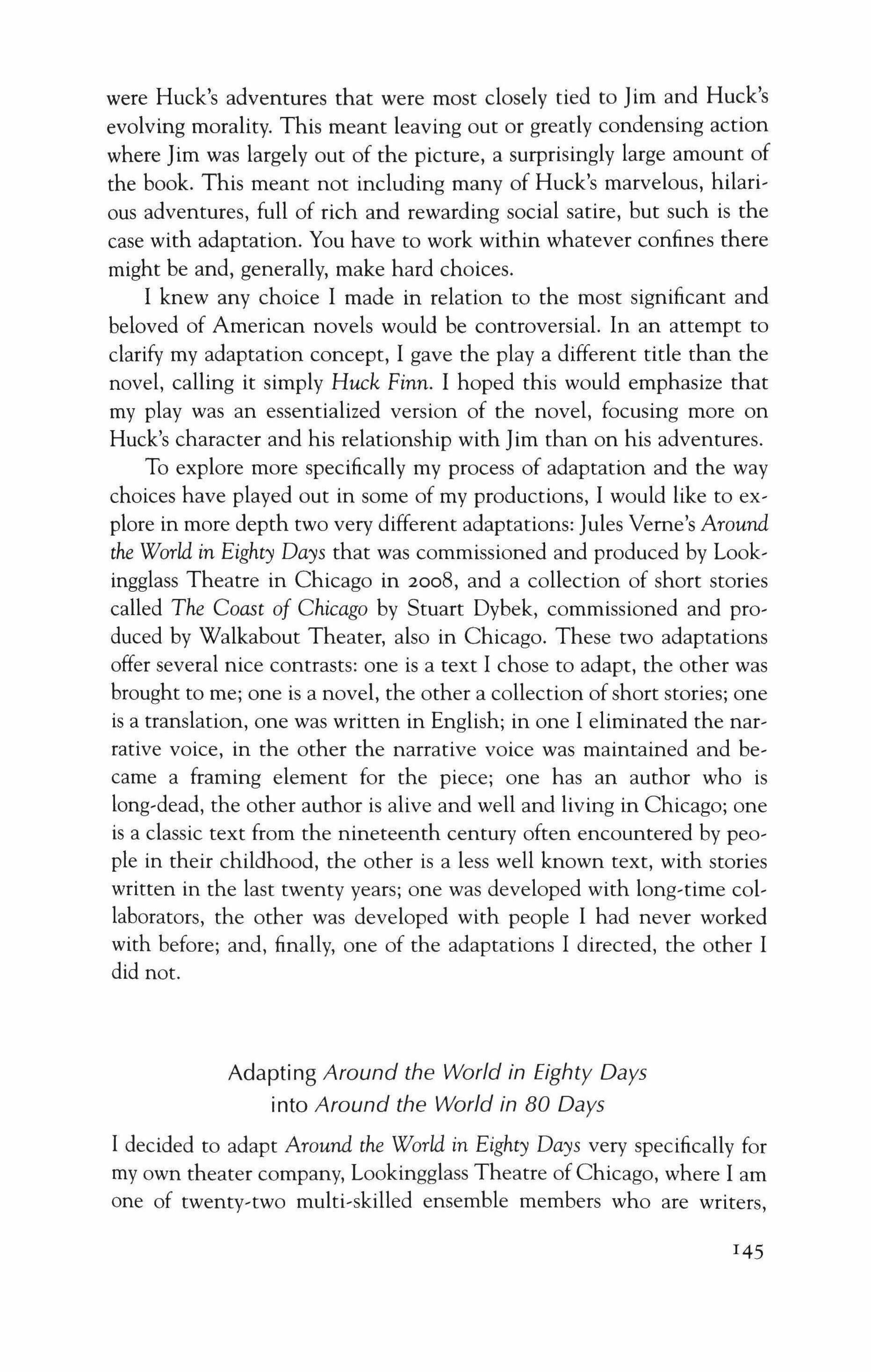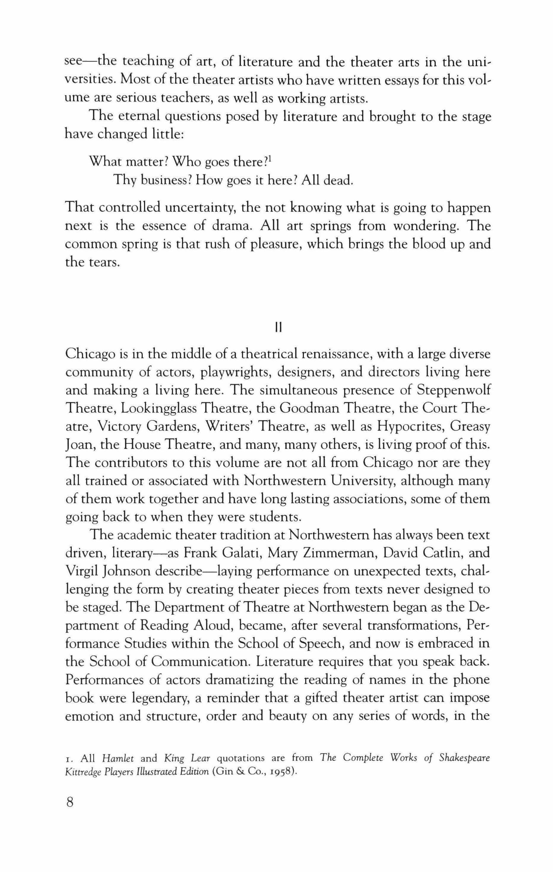 Chicago is in the middle of a theatrical renaissance, with a large diverse community of actors, playwrights, designers, and directors living here and making a living here. The simultaneous presence of Steppenwolf Theatre, Lookingglass Theatre, the Goodman Theatre, the Court Theatre, Victory Gardens, Writers' Theatre, as well as Hypocrites, Greasy Joan, the House Theatre, and many, many others, is living proof of this. The contributors to this volume are not all from Chicago nor are they all trained or associated with Northwestern University, although many of them work together and have long lasting associations, some of them going back to when they were students.