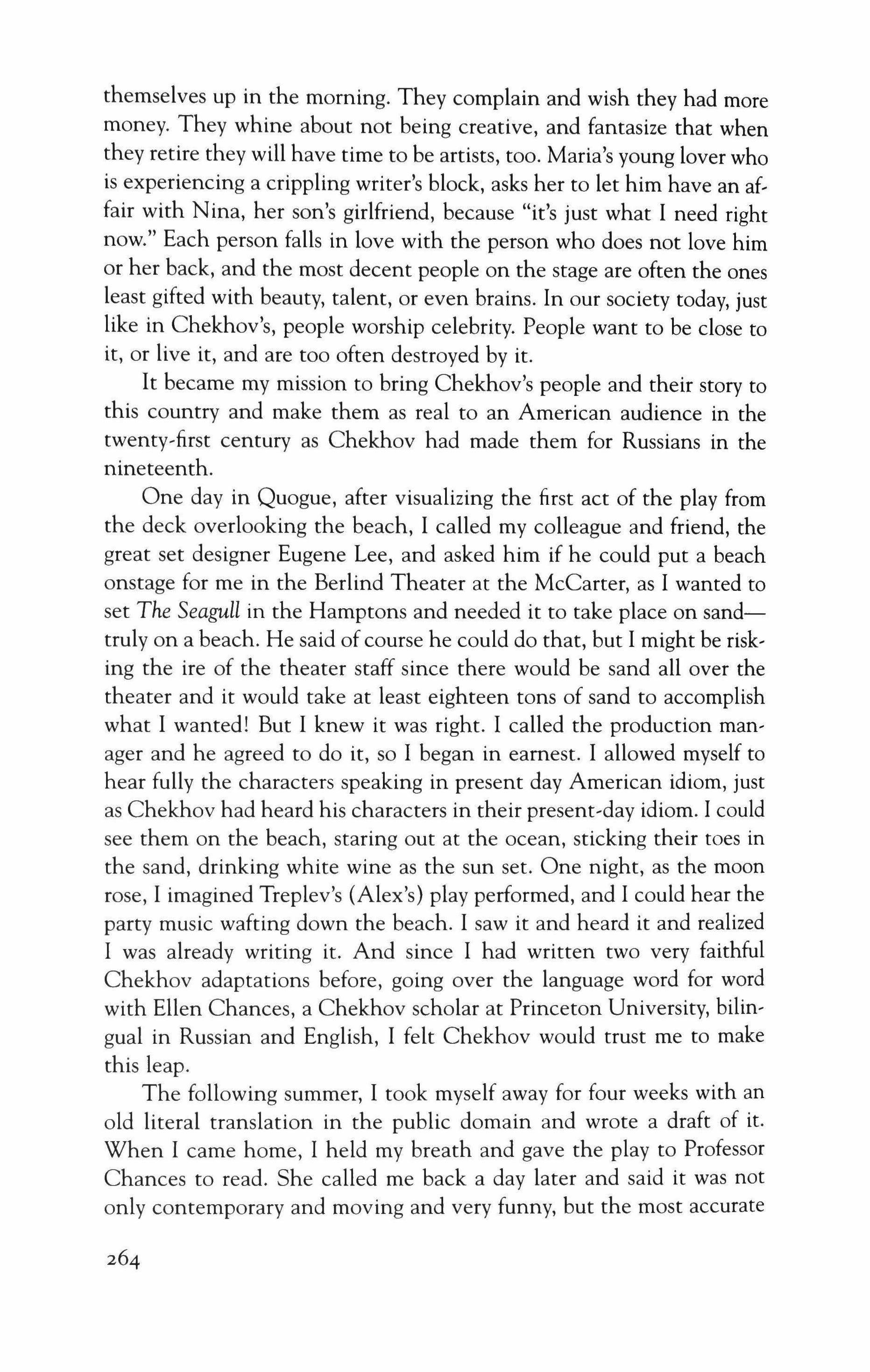 I found The Seagull to be absolutely contemporary once I'd cracked open the place to set it. It is the unchanging human comedy, repeating in every generation. Transcending time and culture, only the details change. On Chekhov's estate, the people play Lotto; in Quogue, they play Scrabble. In Chekhov's day, young people of a certain class spoke in complete sentences, grammatically and precisely. Our young people speak in a different rhythm, encoded for each other. In Chekhov's play, Masha takes snuff; in my adaptation, Milly smokes, but in both versions people still fall hopelessly in love with those who cannot love them back. People still hurt those whom they most want to cherish. Parents still unwittingly crush their children. What I hoped to accomplish with this adaptation is to introduce a new play into the repertory, written by Anton Chekhov, in 2008.