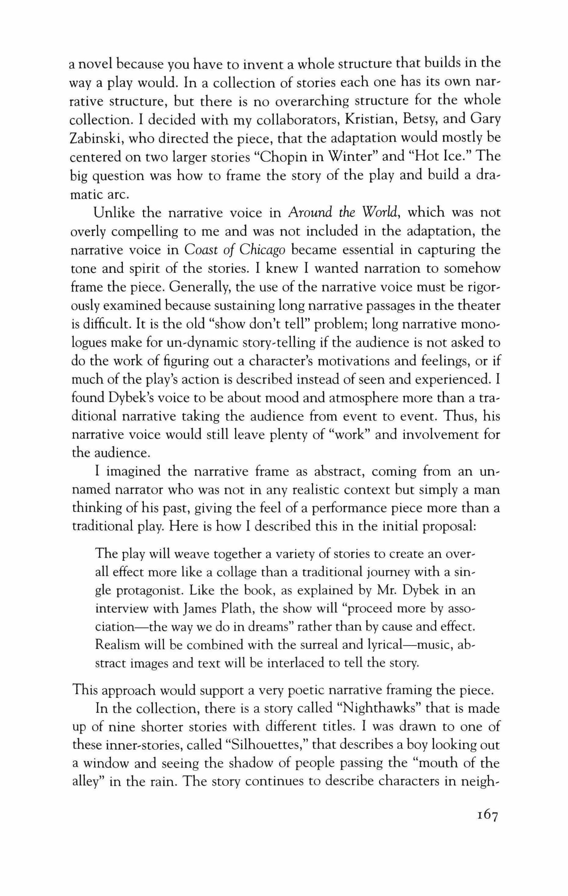 sor of drama. David Catlin has served as director of artistic development, studio teacher, managing director, and currently serves as artistic director of Lookingglass Theater. Directing credits include Lookingglass Alice, Metamorphosis, Her Name was Danger, The Idiot (Jeff Award), and Lookingglass Hamlet. As an actor he was recently seen in Hard Times, Manuscript Found in Saragossa, and Argonautika. His film work includes Since You've Been Gone for Lookingglass/Miramax and Humanoid with Dark Harbor Stories. He lives in Chicago with his wife Kerry and daughters Saylor and Emerson Finn. Stuart Dybek's book The Coast of Chicago, adapted by Laura Eason for the Walkabout Theater, played at the Lookingglass Theater in Chicago in 2006. His I Sailed with Magellan, adapted by Claudia Allen, played at Victory Gardens in Chicago in 2007. Paul Edwards is a Charles Deering McCormick Professor ofTeaching Excellence and associate professor of Performance Studies at Northwestern University. He has received the Joseph Jefferson Award and Citation, the After Dark Award, and the Leslie Irene Coger Award for stage productions, and the Lilla A. Heston Award for essays on performance history. laura Eason is the author of more than fifteen playsboth original work and adaptations. More than ten ofher full-length plays have been produced at theaters across the country. Her work is published by Broadway Play Publishing, where she was named playwright of the year in 2007. In New York, she is an Affiliated Artist and Kitchen Cabinet member of the Obie-winning New Georges, a playwright member of the