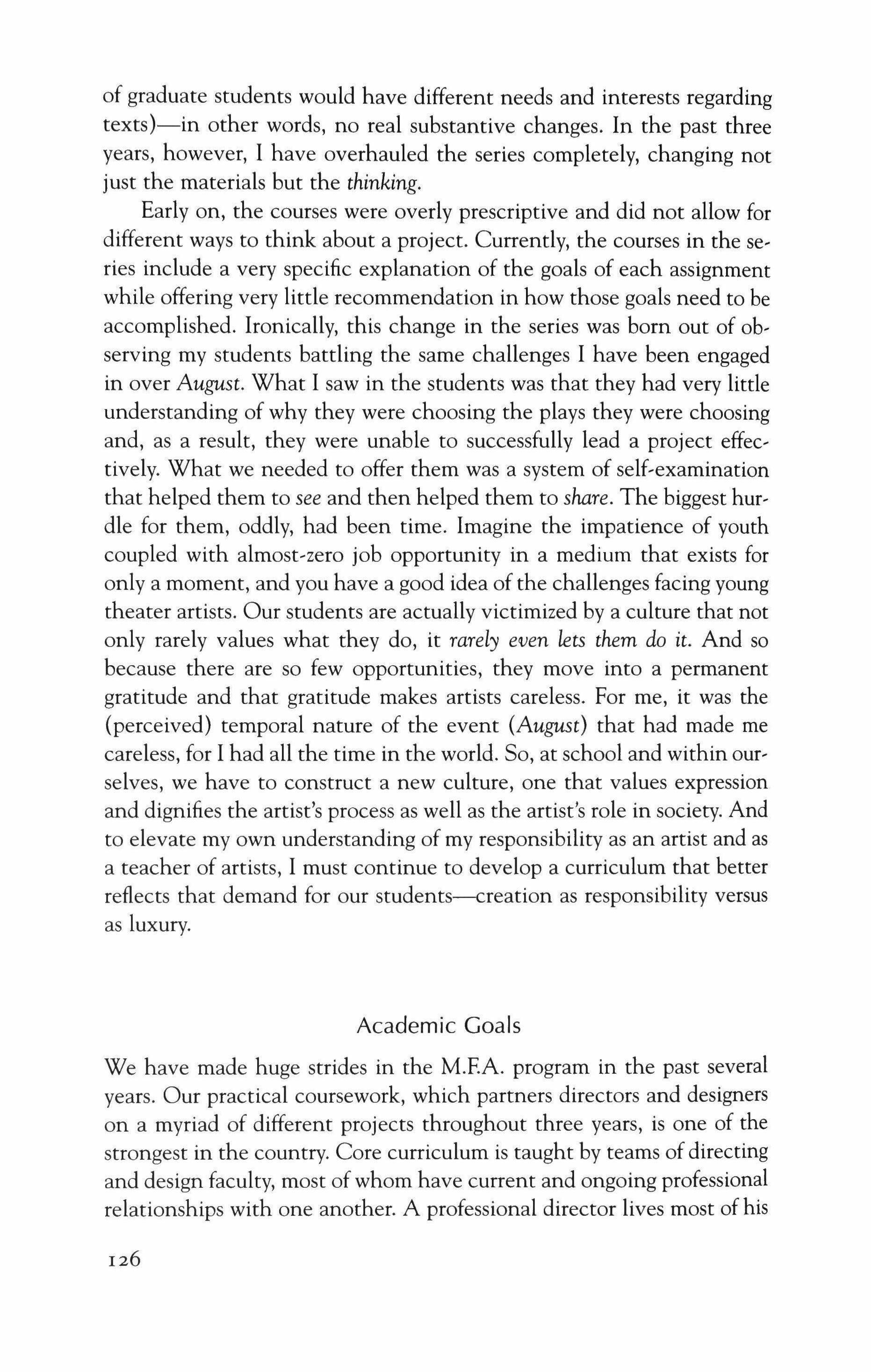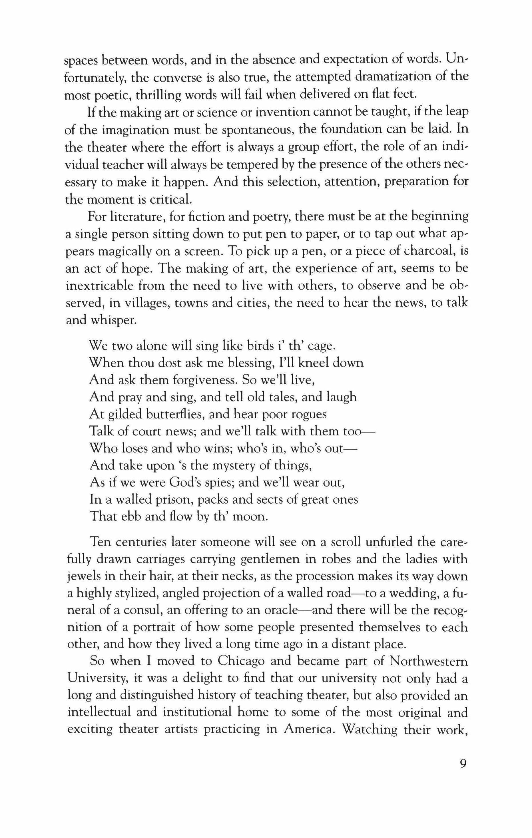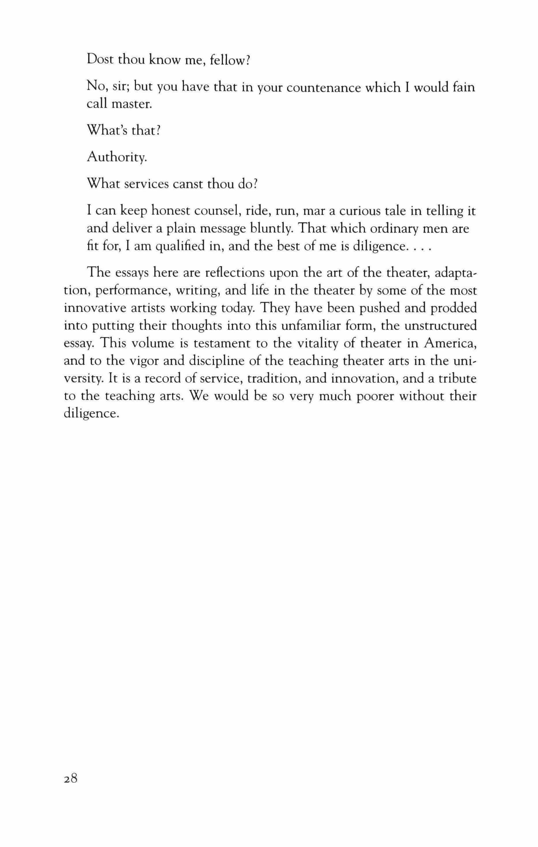 see-the teaching of art, of literature and the theater arts in the universities. Most of the theater artists who have written essays for this volume are serious teachers, as well as working artists.