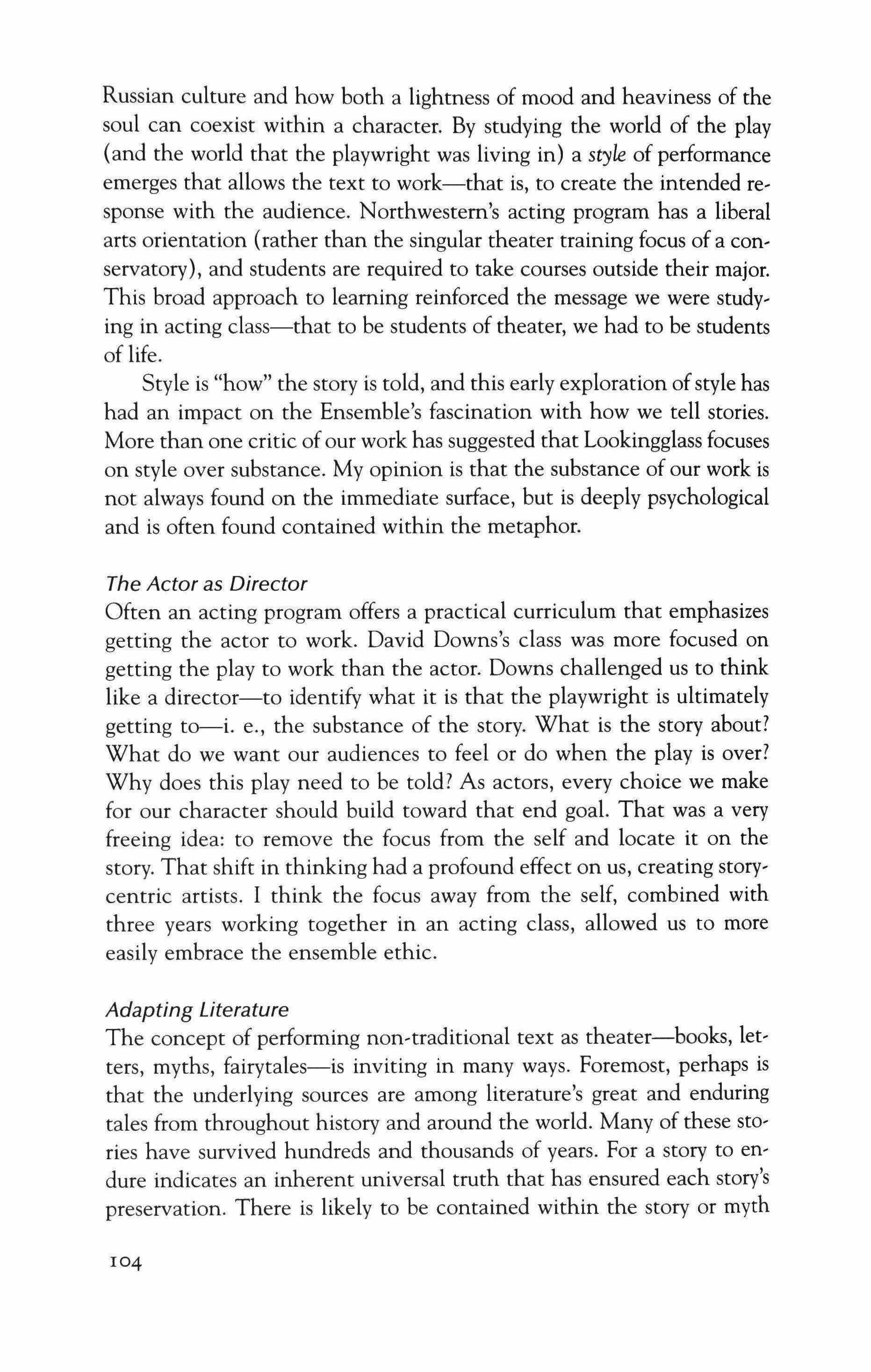 The academic theater tradition at Northwestern has always been text driven, literary-as Frank Galati, Mary Zimmerman, David Catlin, and Virgil Johnson describe-laying performance on unexpected texts, challenging the form by creating theater pieces from texts never designed to be staged. The Department of Theatre at Northwestern began as the Department of Reading Aloud, became, after several transformations, Performance Studies within the School of Speech, and now is embraced in the School of Communication. Literature requires that you speak back. Performances of actors dramatizing the reading of names in the phone book were legendary, a reminder that a gifted theater artist can impose emotion and structure, order and beauty on any series of words, in the