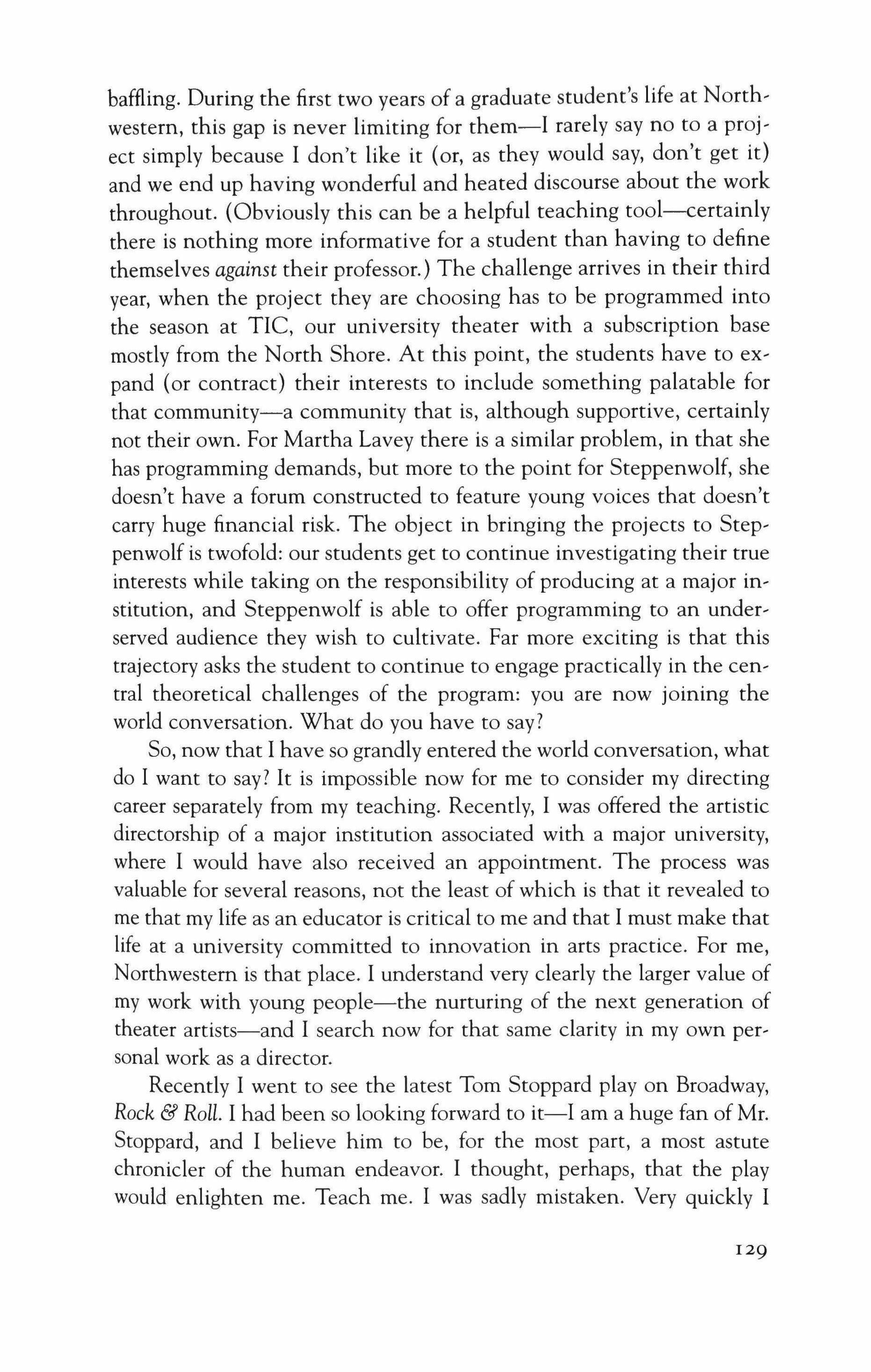 So when I moved to Chicago and became part of Northwestern University, it was a delight to find that our university not only had a long and distinguished history of teaching theater, but also provided an intellectual and institutional home to some of the most original and exciting theater artists practicing in America. Watching their work,