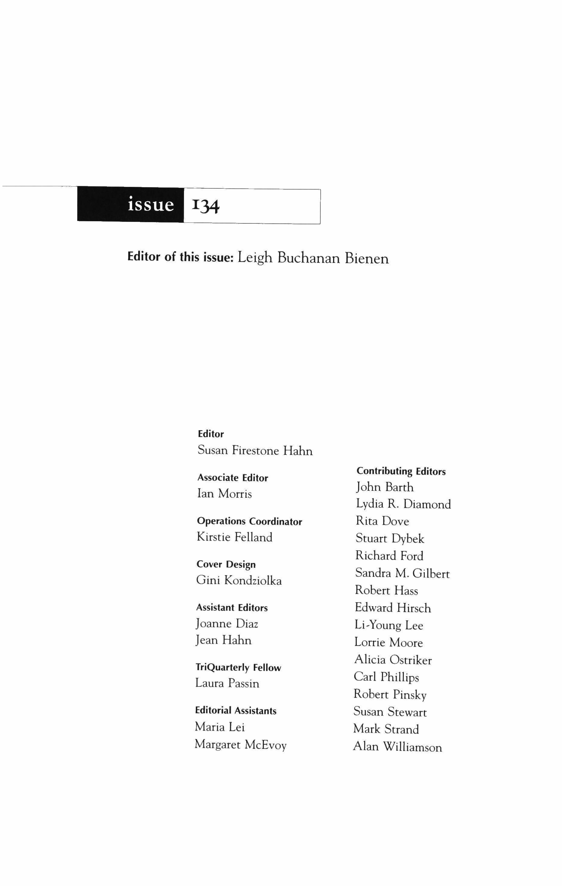 Publication of TriQuarterly is made possible in part by the donors of gifts and grants to the magazine. For their recent and continuing support, we are very pleased to thank the Illinois Arts Council, the Lannan Foundation, the National Endowment for the Arts, the Sara Lee Foundation, the Wendling Foundation and individual donors.