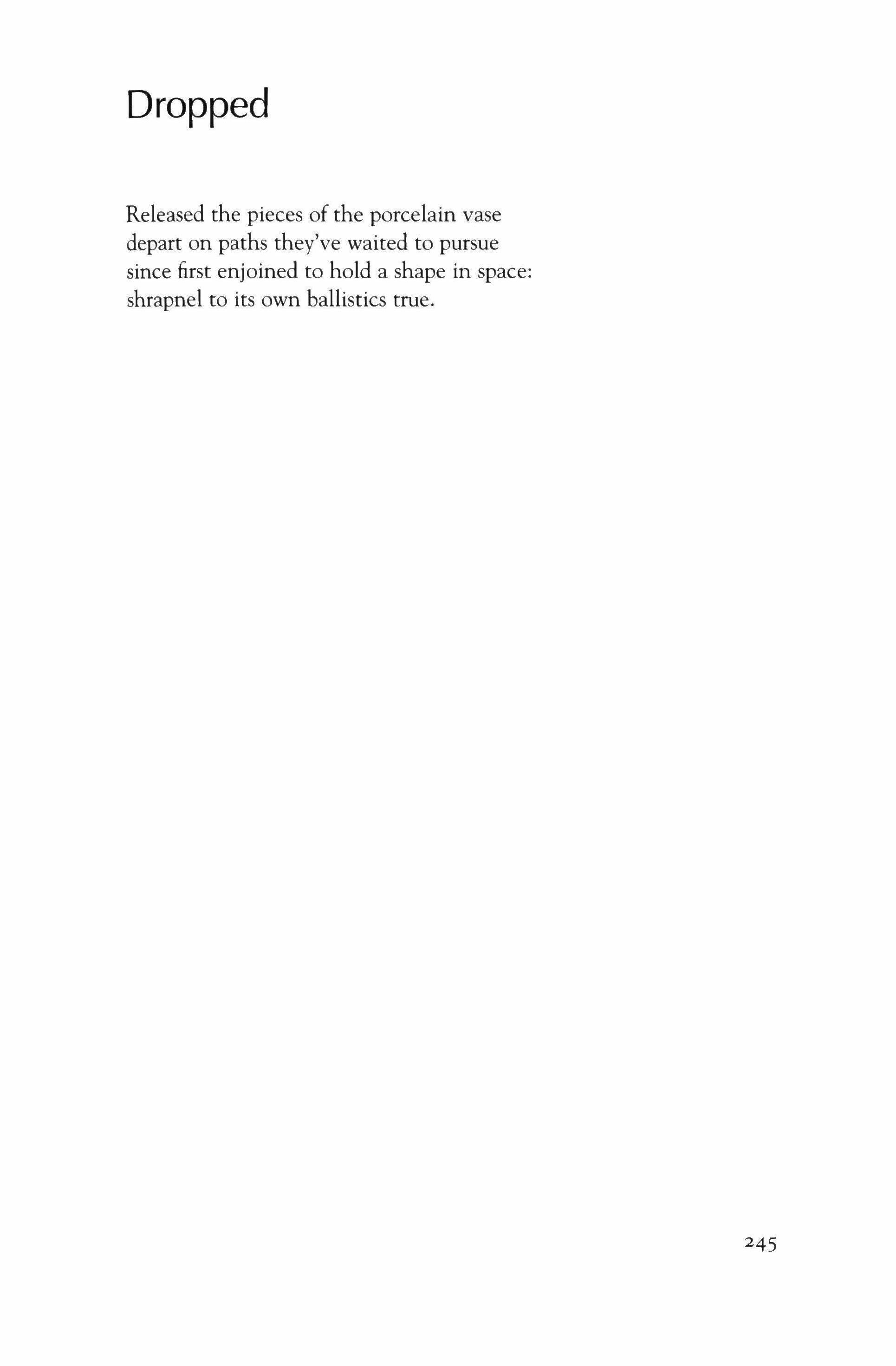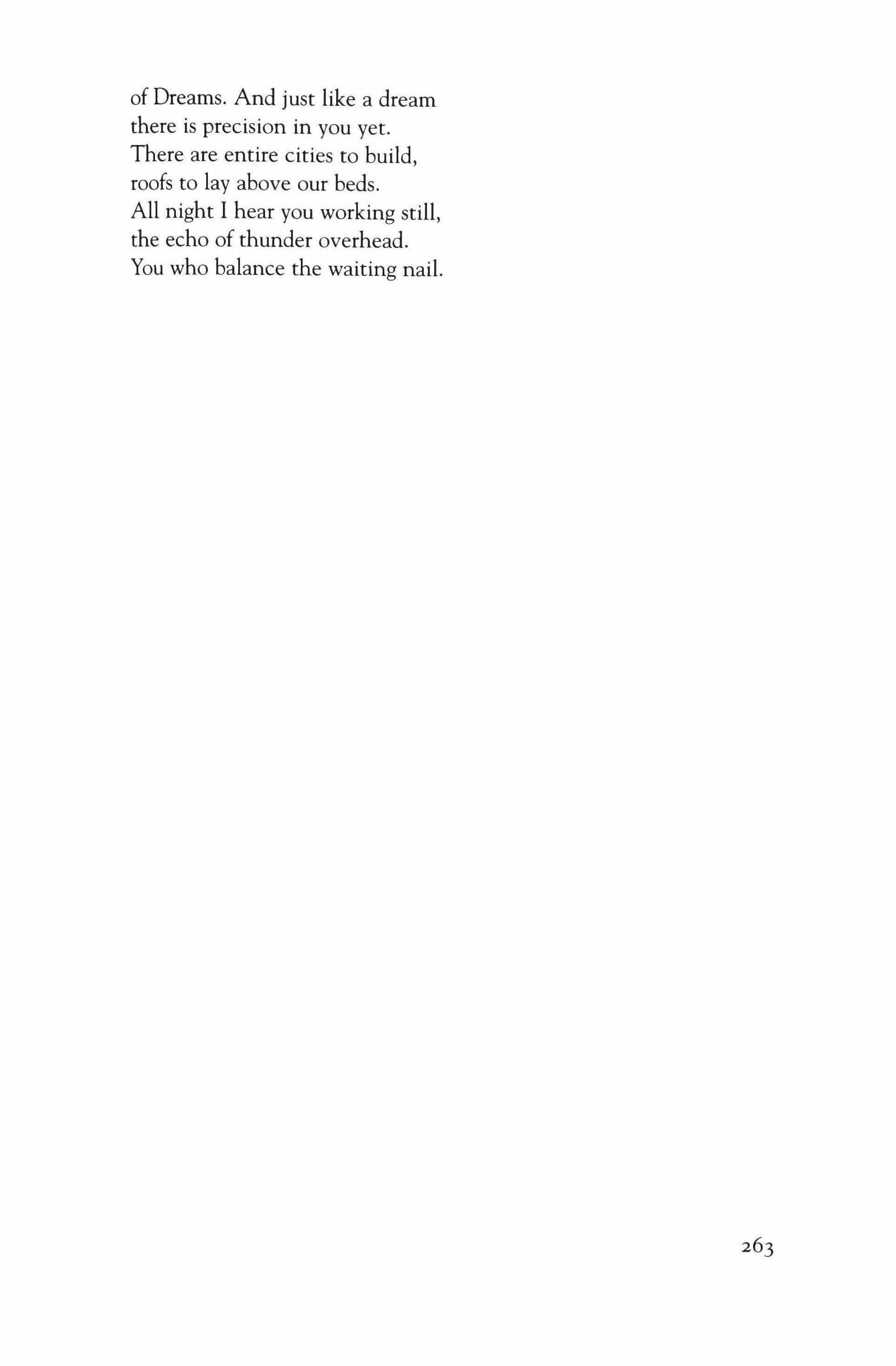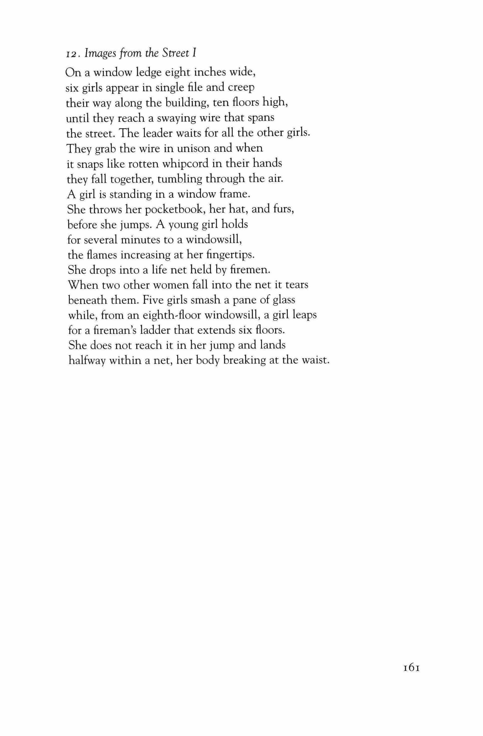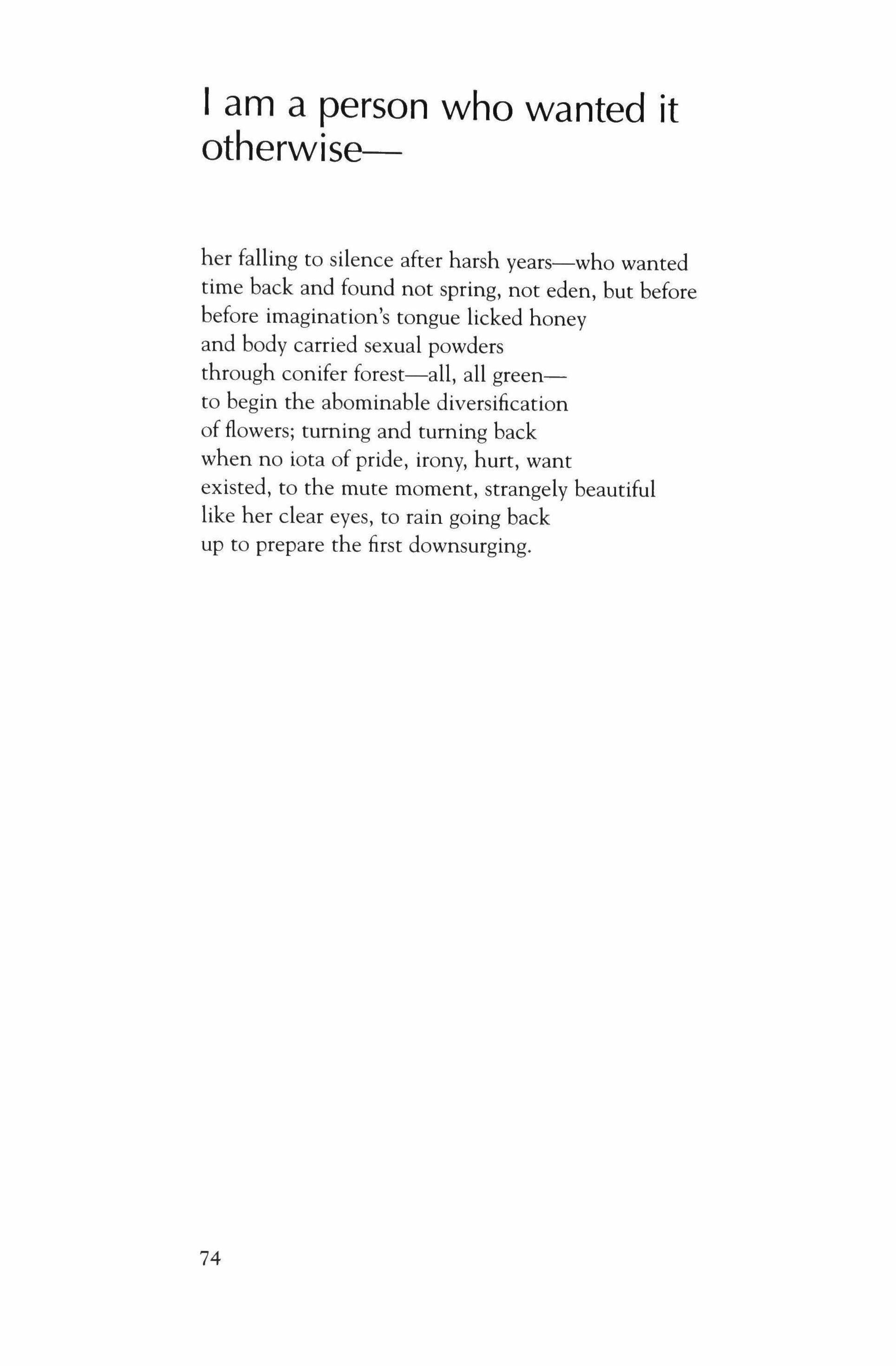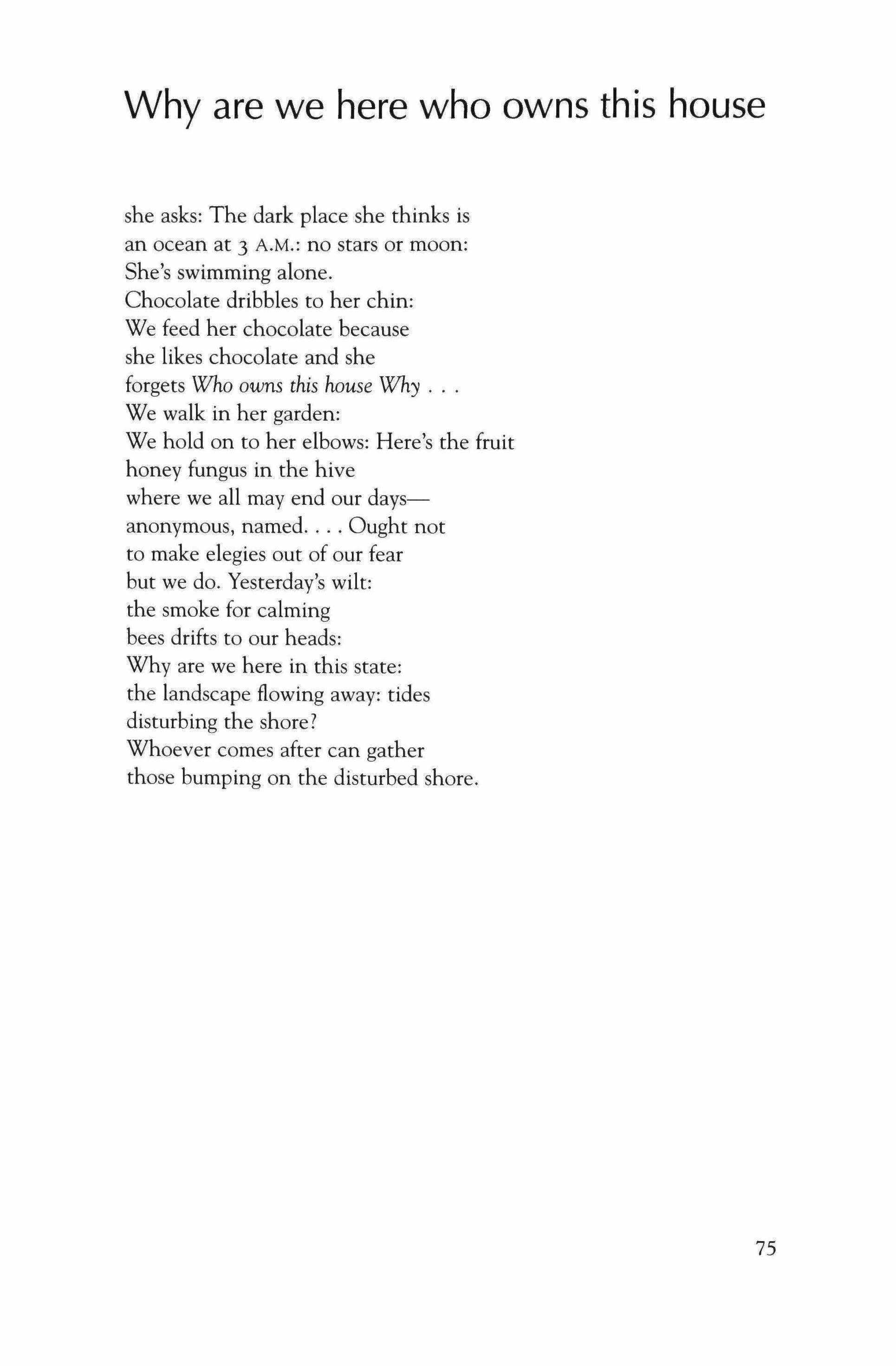 71 That was the mind's wild swarm trapezing from an oak limb; She wears geegaws from relatives; She saw that the tortured dream wrestled to the floor; I am a person who wanted it otherwise; Why are we here Who owns this house; The mind's trick mirror has made of every glimmer