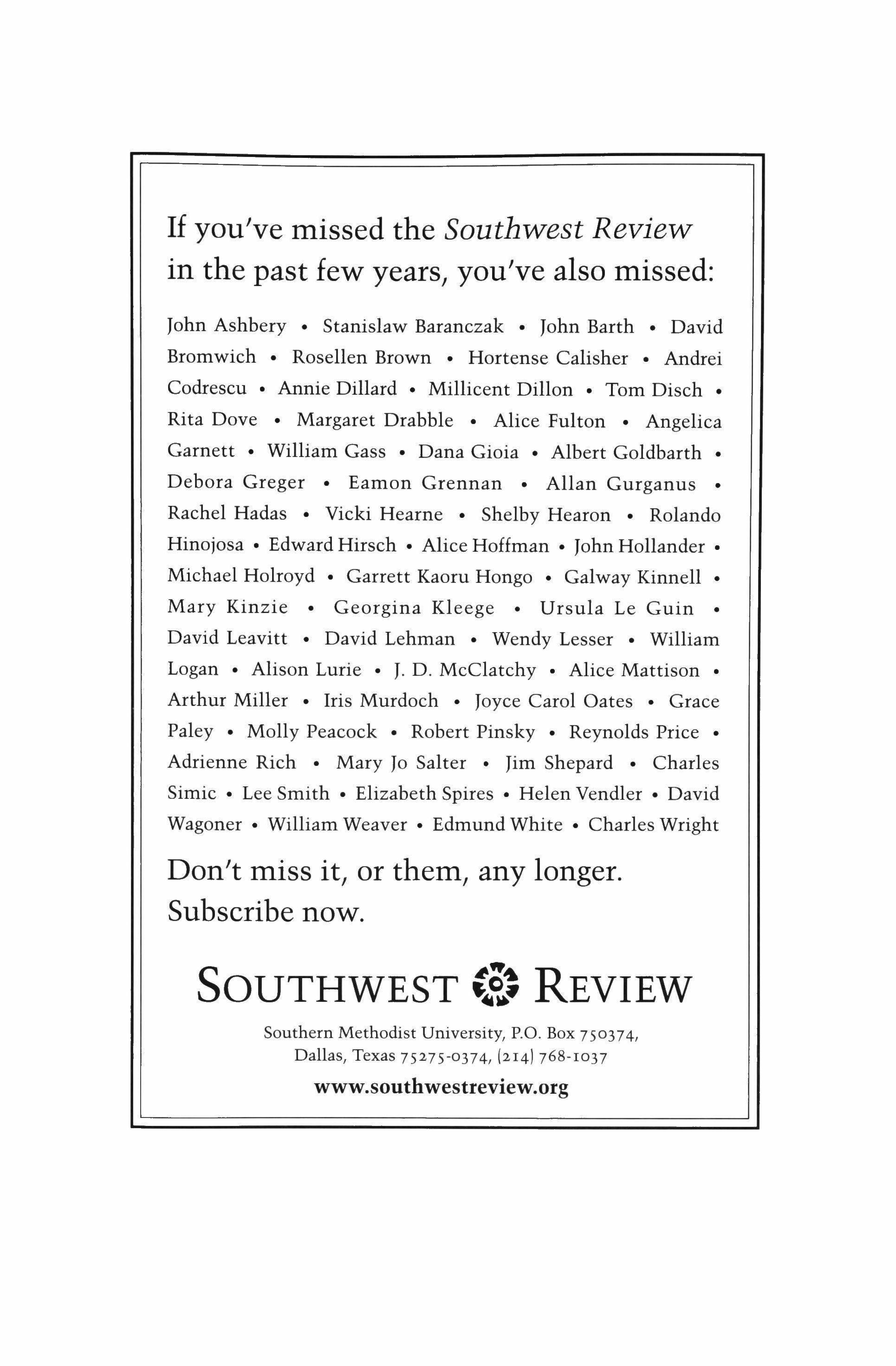 Don't miss it, or them, any longer. Subscribe now. SOUTHWEST ��� REVIEW Southern Methodist University, P.O. Box 750374, Dallas, Texas 75275-0374, (2141768-1037 www.southwestreview.org