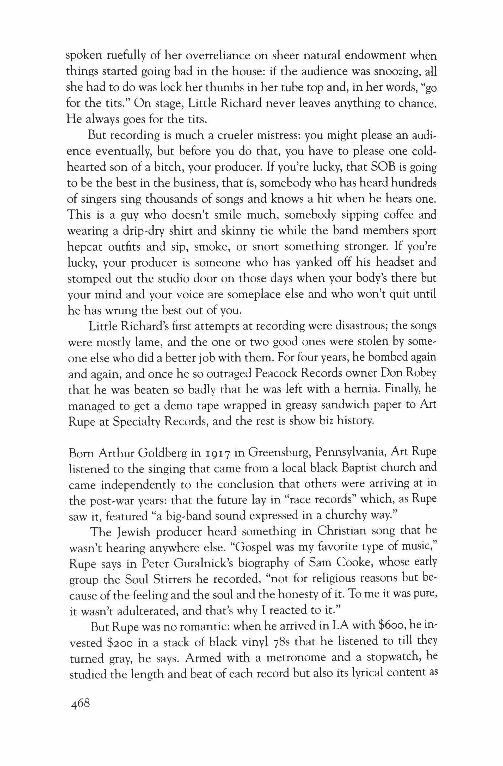 Art Rupe wasn't so sure. He did his best to keep the singer at a distance for seven or eight months, but in cases like this, Little Richard is the one who decides how wide or narrow that gap's going to be. Every fourth or fifth day, Rupe remembered, Little Richard called from Fort Lauderdale, Jacksonville, Atlanta: wherever the road took him.