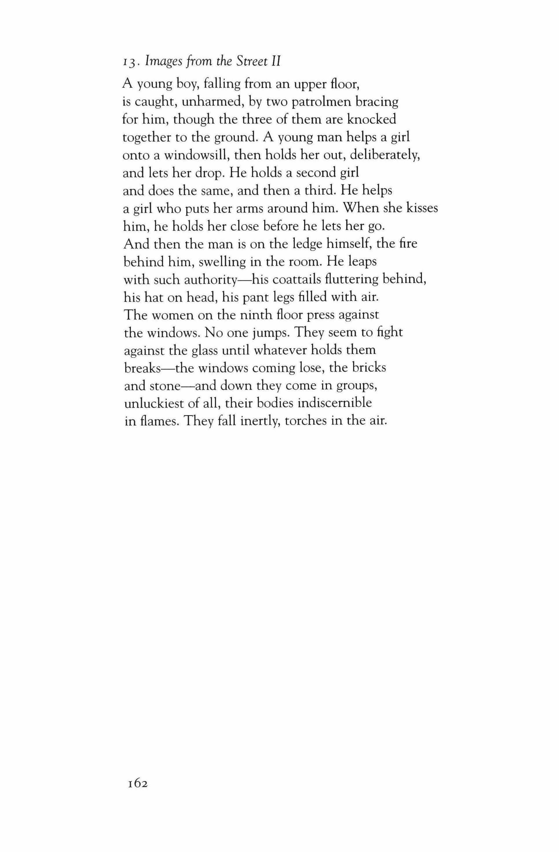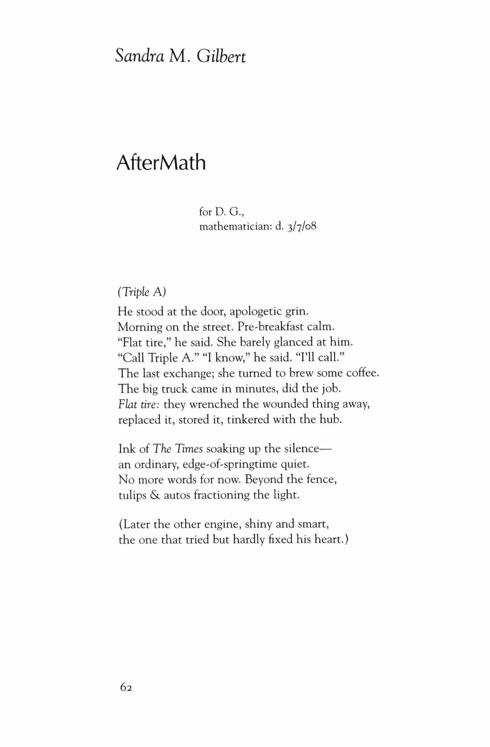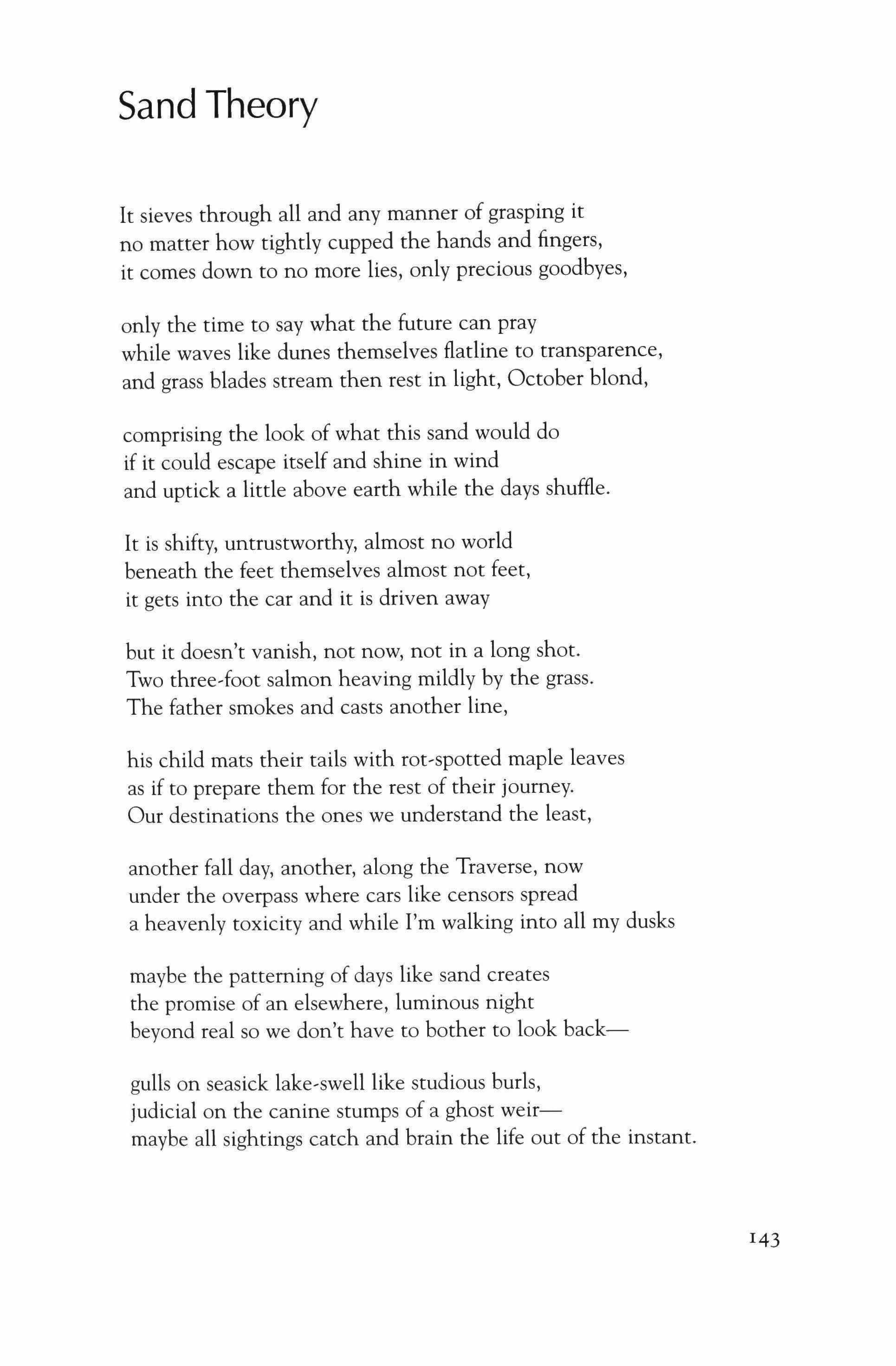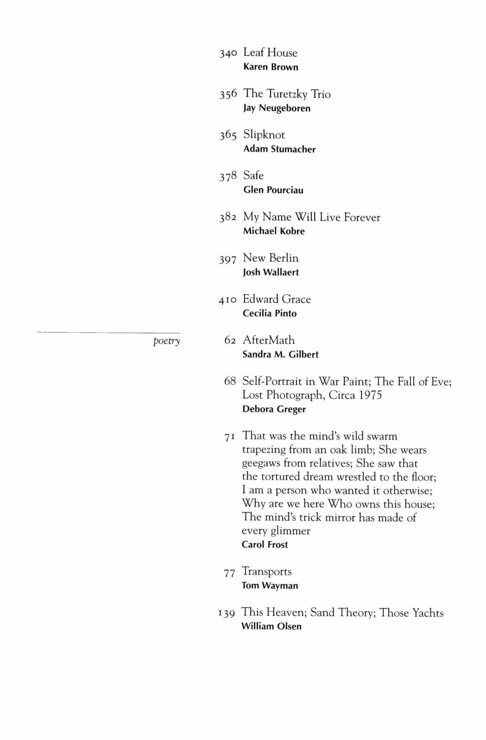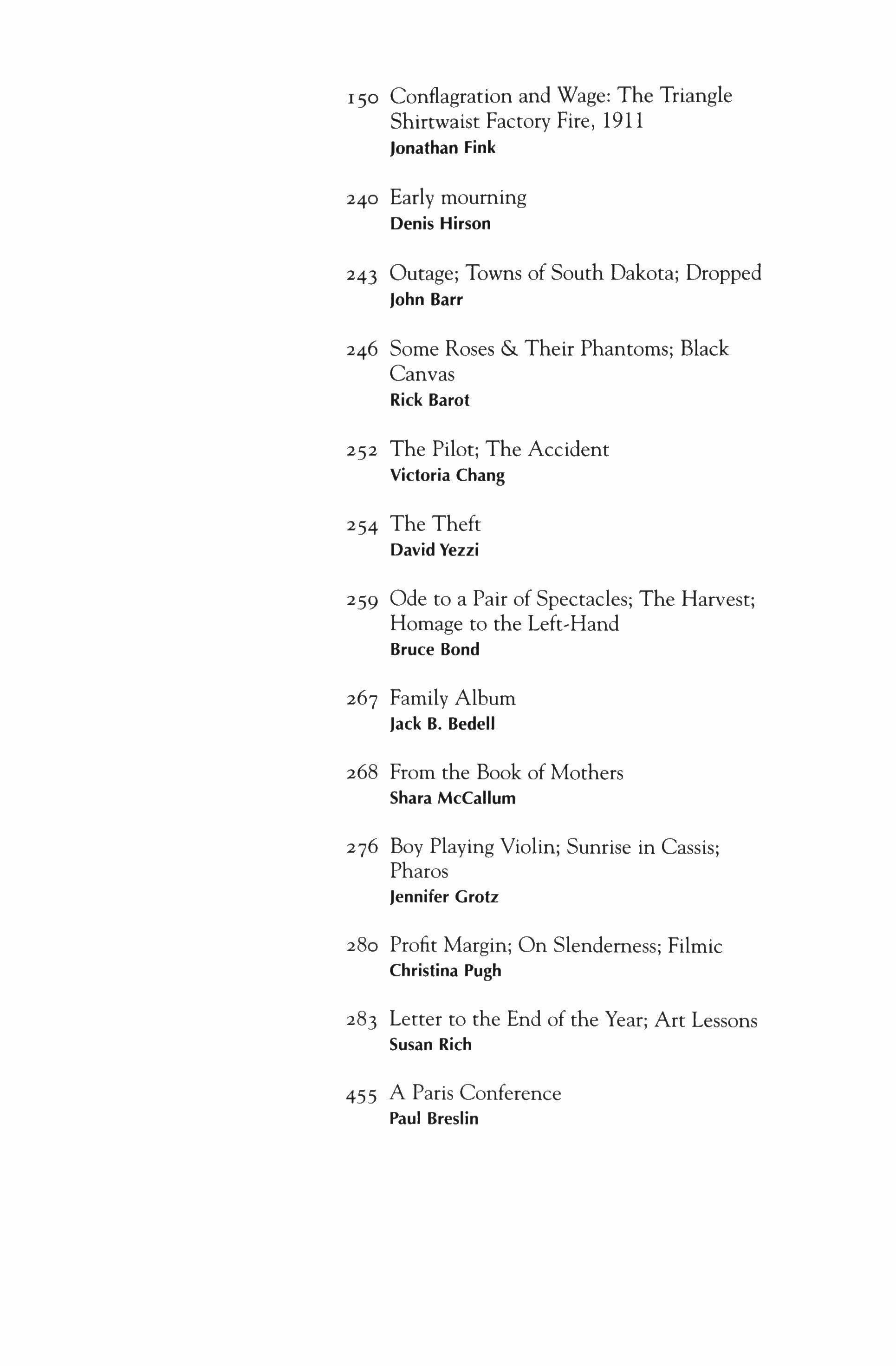 ton, 2006), and On Burning Ground: Thirty Years ofThinking About Poetry (University of Michigan Press, 2009). She is currently at work on a new collection of verse, of which "Aftermath" is the title poem and a prose work tentatively titled The Culinary Imagination. William Giraldi teaches at Boston University and is Senior Fiction Editor for the journal AGNI. His work has appeared recently in Georgia Review, Southern Review, Kenyon Review, and Antioch Review. laurence Goldstein is Professor English at the University of Michigan and the editor of Michigan Quarterly Review from 19772009. His fourth book of poems is A Room in California (Northwestern University Press/TriQuarterly Books, 2005). With Robert Chrisman, he coedited Robert Hayden: Essays on the Poetry (University of Michigan Press, 2005.). Debora Greger's most recent book of poems, Men, Women, and Ghosts, was published by Penguin in 2008. Jennifer Grotz is the author of Cusp (Houghton Mifflin, 2003). Brian Henry's most recent book is The Stripping Point (Counterpath, 2007). His translation of Tomas Salamua's Woods and Chalices appeared from Harcourt in 2008. Denis Hirson has published five books, all of them concerned with the memory of the apartheid years in South Africa, all of them crossing the frontier between prose and poetry: The House Next Door to Africa, I Remember King Kong (the Boxer), We Walk Straight So You Better Get Out the Way, White Scars, and Gardening in the Dark. White Scars was runner-up in 2007 for the major South African non-fiction prize, the Alan Paton Award. Hirson is