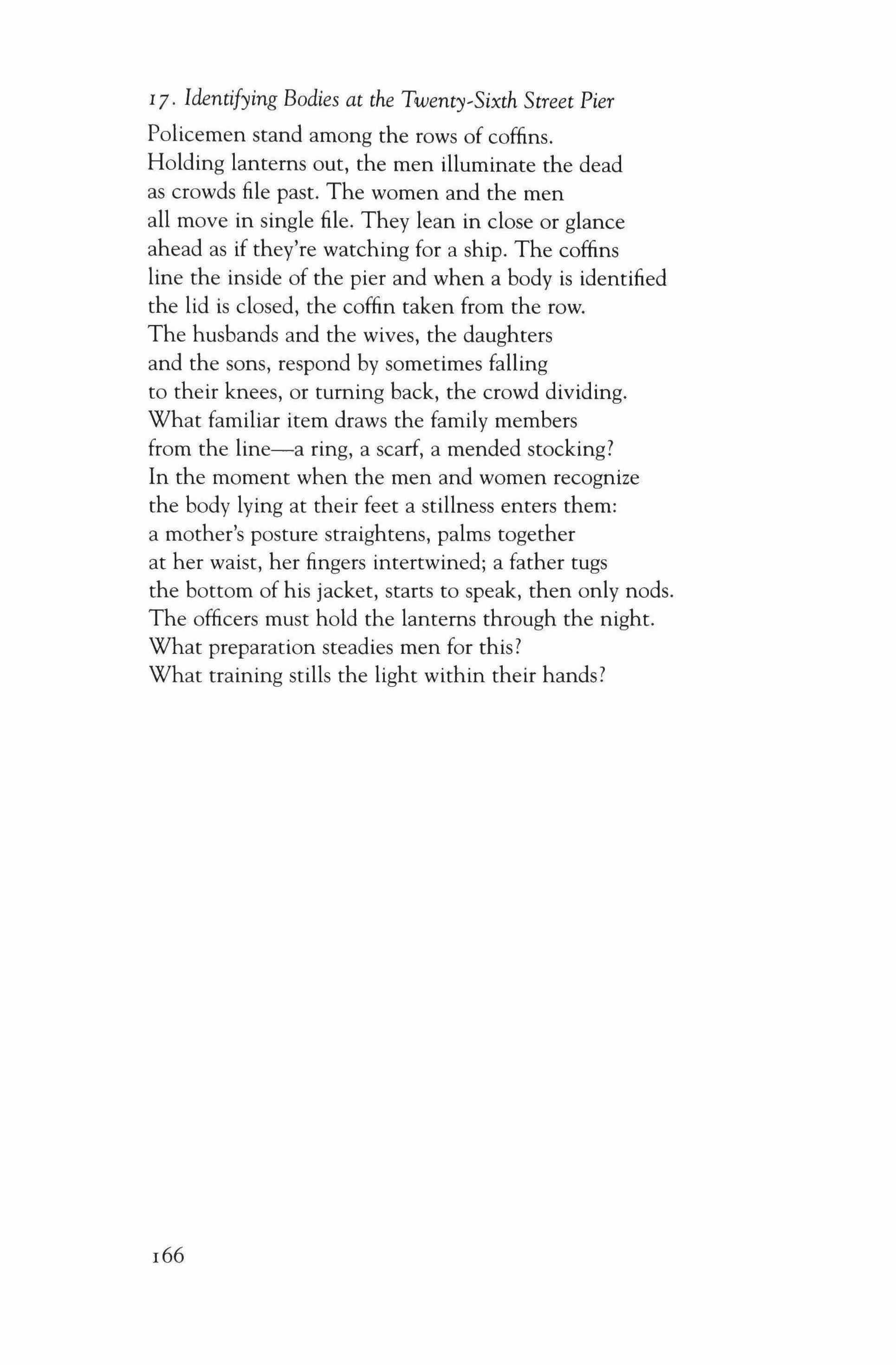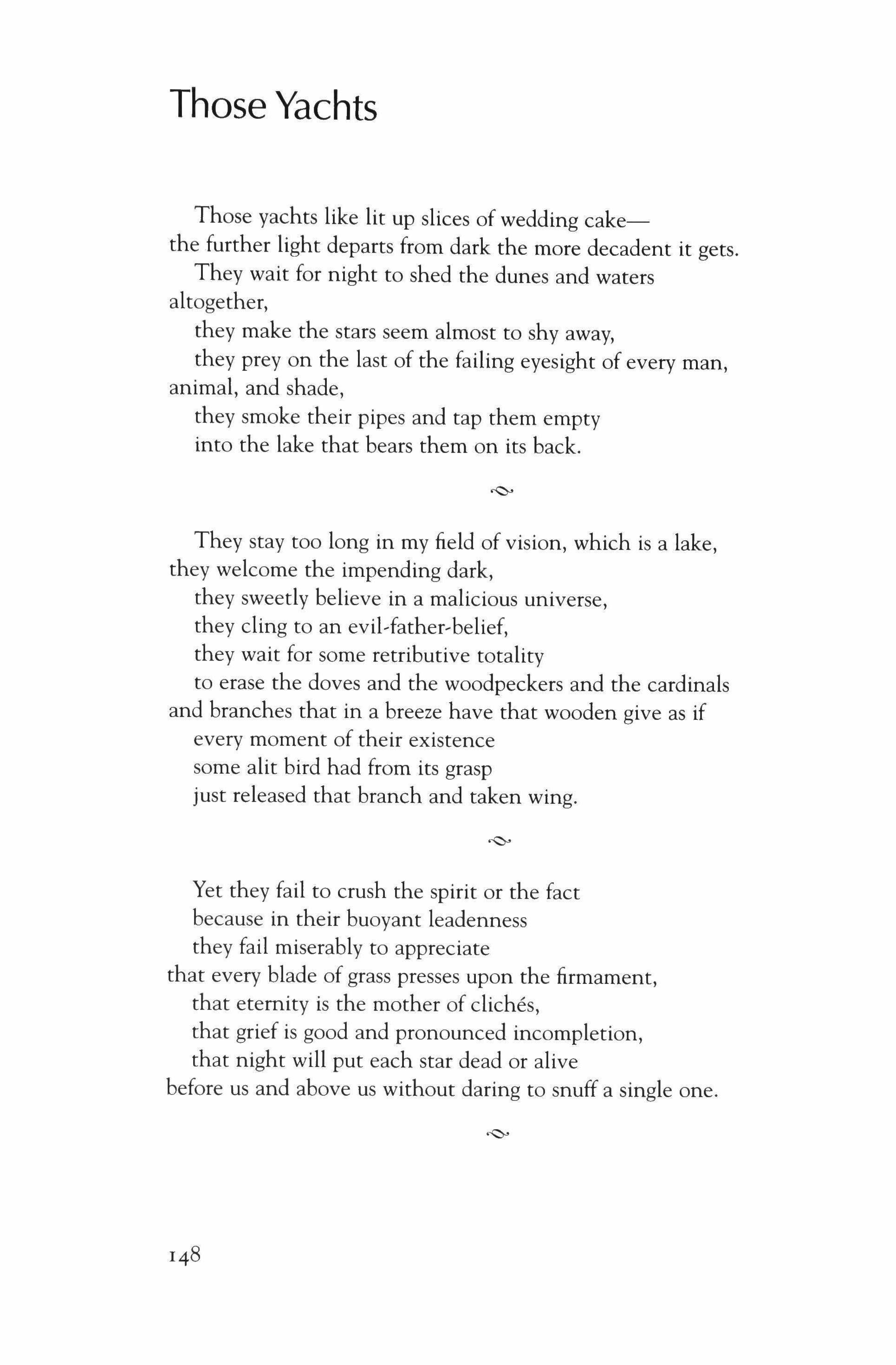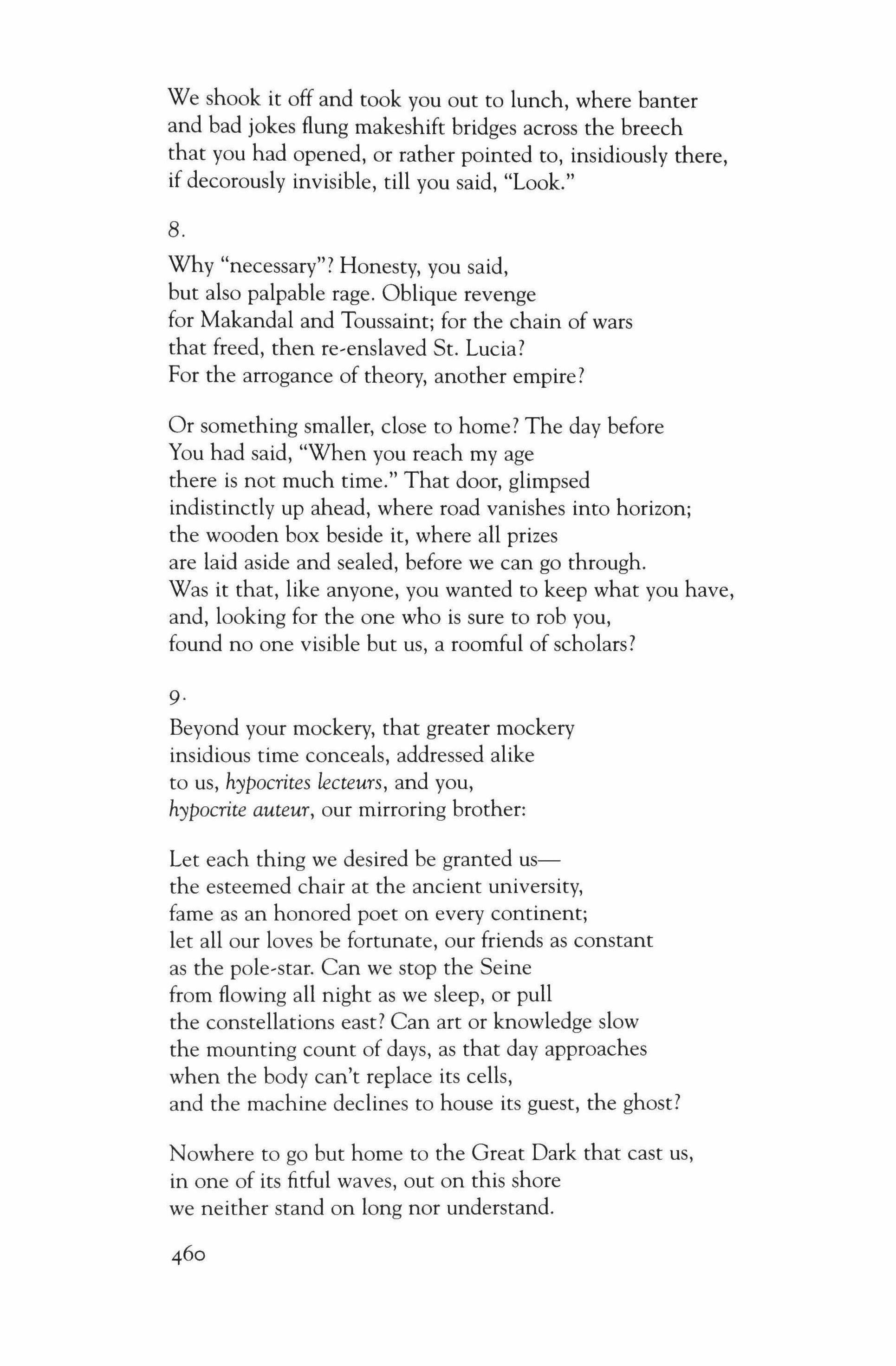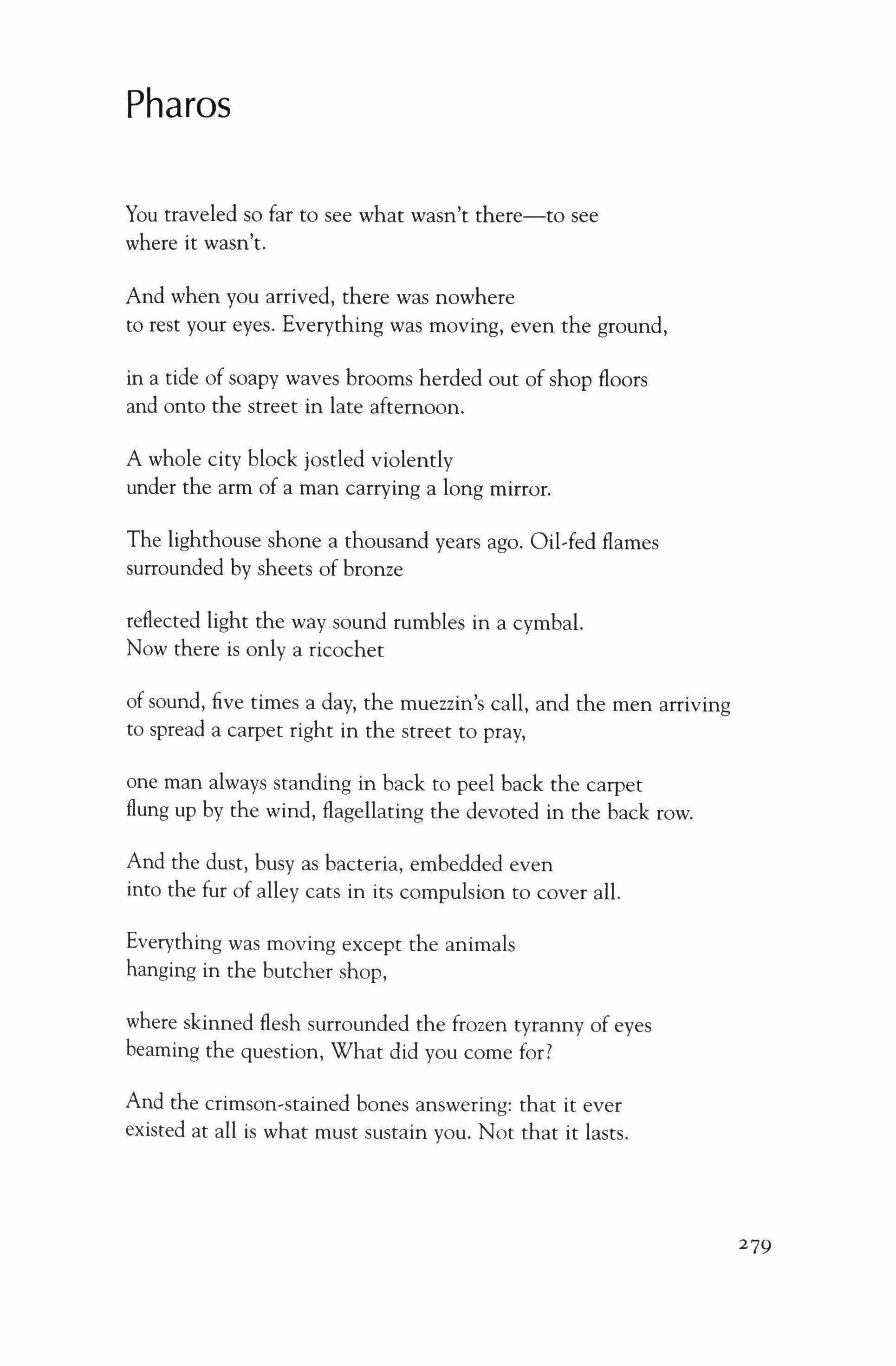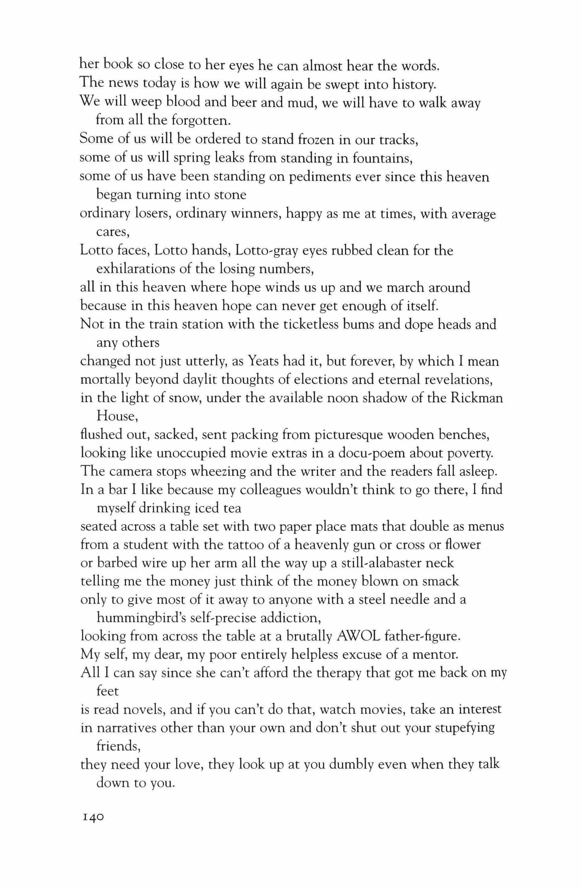 ton, 2006), and On Burning Ground: Thirty Years ofThinking About Poetry (University of Michigan Press, 2009). She is currently at work on a new collection of verse, of which "Aftermath" is the title poem and a prose work tentatively titled The Culinary Imagination. William Giraldi teaches at Boston University and is Senior Fiction Editor for the journal AGNI. His work has appeared recently in Georgia Review, Southern Review, Kenyon Review, and Antioch Review. laurence Goldstein is Professor English at the University of Michigan and the editor of Michigan Quarterly Review from 19772009. His fourth book of poems is A Room in California (Northwestern University Press/TriQuarterly Books, 2005). With Robert Chrisman, he coedited Robert Hayden: Essays on the Poetry (University of Michigan Press, 2005.). Debora Greger's most recent book of poems, Men, Women, and Ghosts, was published by Penguin in 2008. Jennifer Grotz is the author of Cusp (Houghton Mifflin, 2003). Brian Henry's most recent book is The Stripping Point (Counterpath, 2007). His translation of Tomas Salamua's Woods and Chalices appeared from Harcourt in 2008. Denis Hirson has published five books, all of them concerned with the memory of the apartheid years in South Africa, all of them crossing the frontier between prose and poetry: The House Next Door to Africa, I Remember King Kong (the Boxer), We Walk Straight So You Better Get Out the Way, White Scars, and Gardening in the Dark. White Scars was runner-up in 2007 for the major South African non-fiction prize, the Alan Paton Award. Hirson is