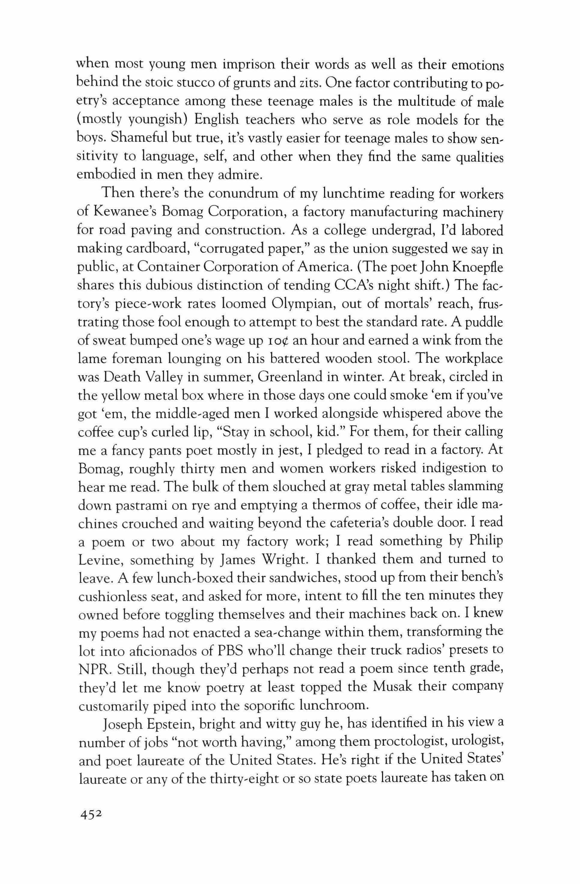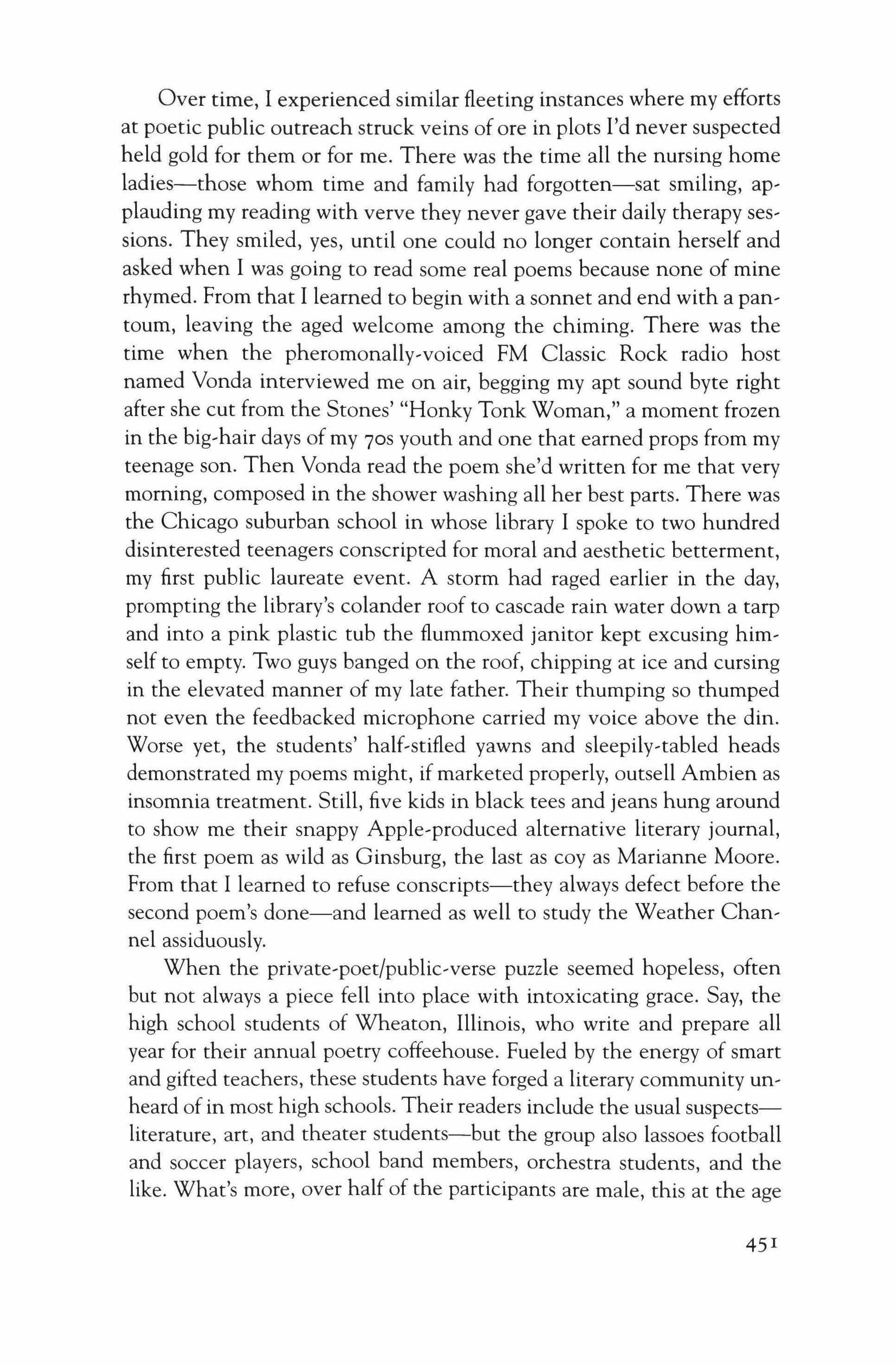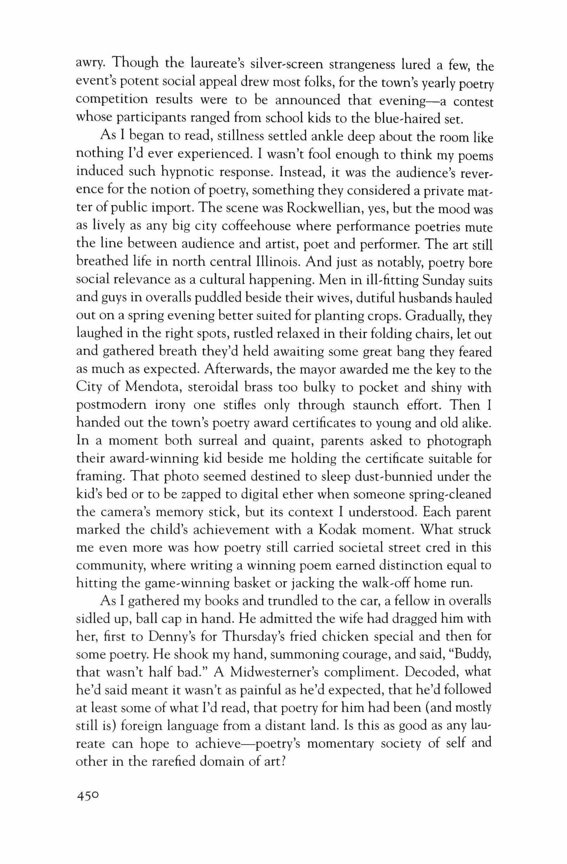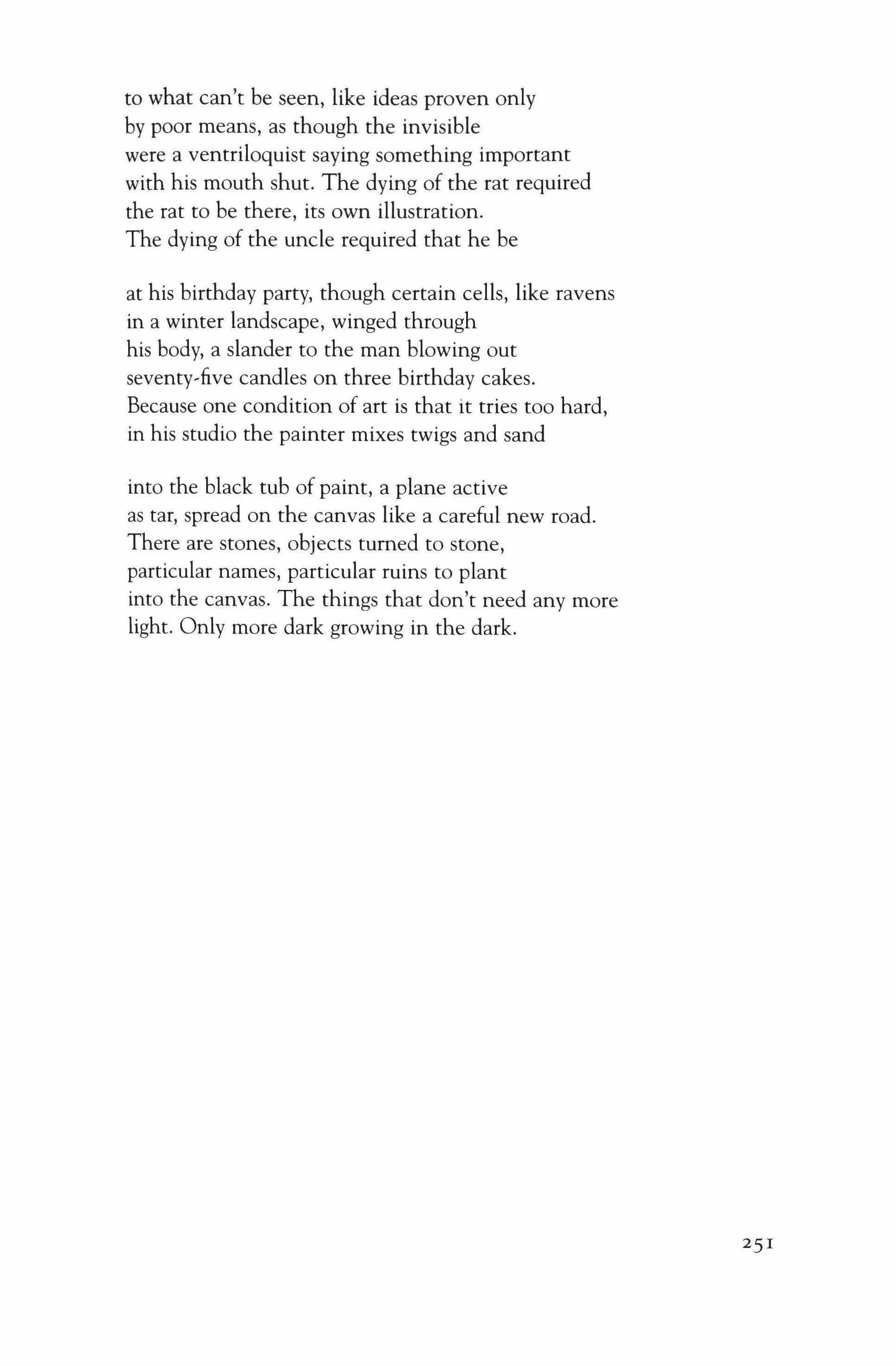 ton, 2006), and On Burning Ground: Thirty Years ofThinking About Poetry (University of Michigan Press, 2009). She is currently at work on a new collection of verse, of which "Aftermath" is the title poem and a prose work tentatively titled The Culinary Imagination. William Giraldi teaches at Boston University and is Senior Fiction Editor for the journal AGNI. His work has appeared recently in Georgia Review, Southern Review, Kenyon Review, and Antioch Review. laurence Goldstein is Professor English at the University of Michigan and the editor of Michigan Quarterly Review from 19772009. His fourth book of poems is A Room in California (Northwestern University Press/TriQuarterly Books, 2005). With Robert Chrisman, he coedited Robert Hayden: Essays on the Poetry (University of Michigan Press, 2005.). Debora Greger's most recent book of poems, Men, Women, and Ghosts, was published by Penguin in 2008. Jennifer Grotz is the author of Cusp (Houghton Mifflin, 2003). Brian Henry's most recent book is The Stripping Point (Counterpath, 2007). His translation of Tomas Salamua's Woods and Chalices appeared from Harcourt in 2008. Denis Hirson has published five books, all of them concerned with the memory of the apartheid years in South Africa, all of them crossing the frontier between prose and poetry: The House Next Door to Africa, I Remember King Kong (the Boxer), We Walk Straight So You Better Get Out the Way, White Scars, and Gardening in the Dark. White Scars was runner-up in 2007 for the major South African non-fiction prize, the Alan Paton Award. Hirson is