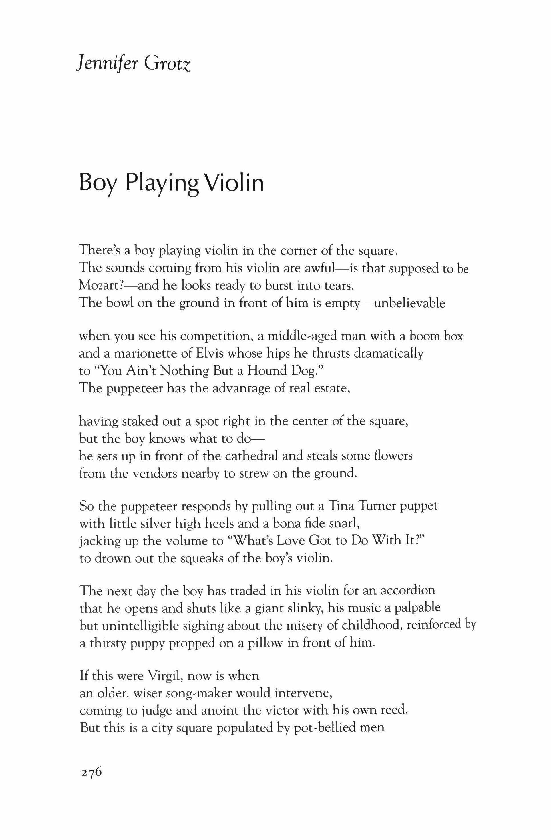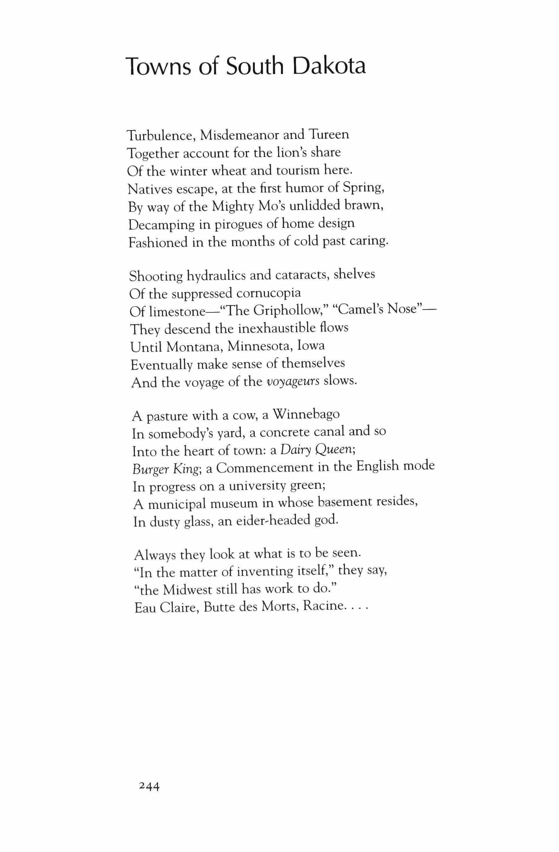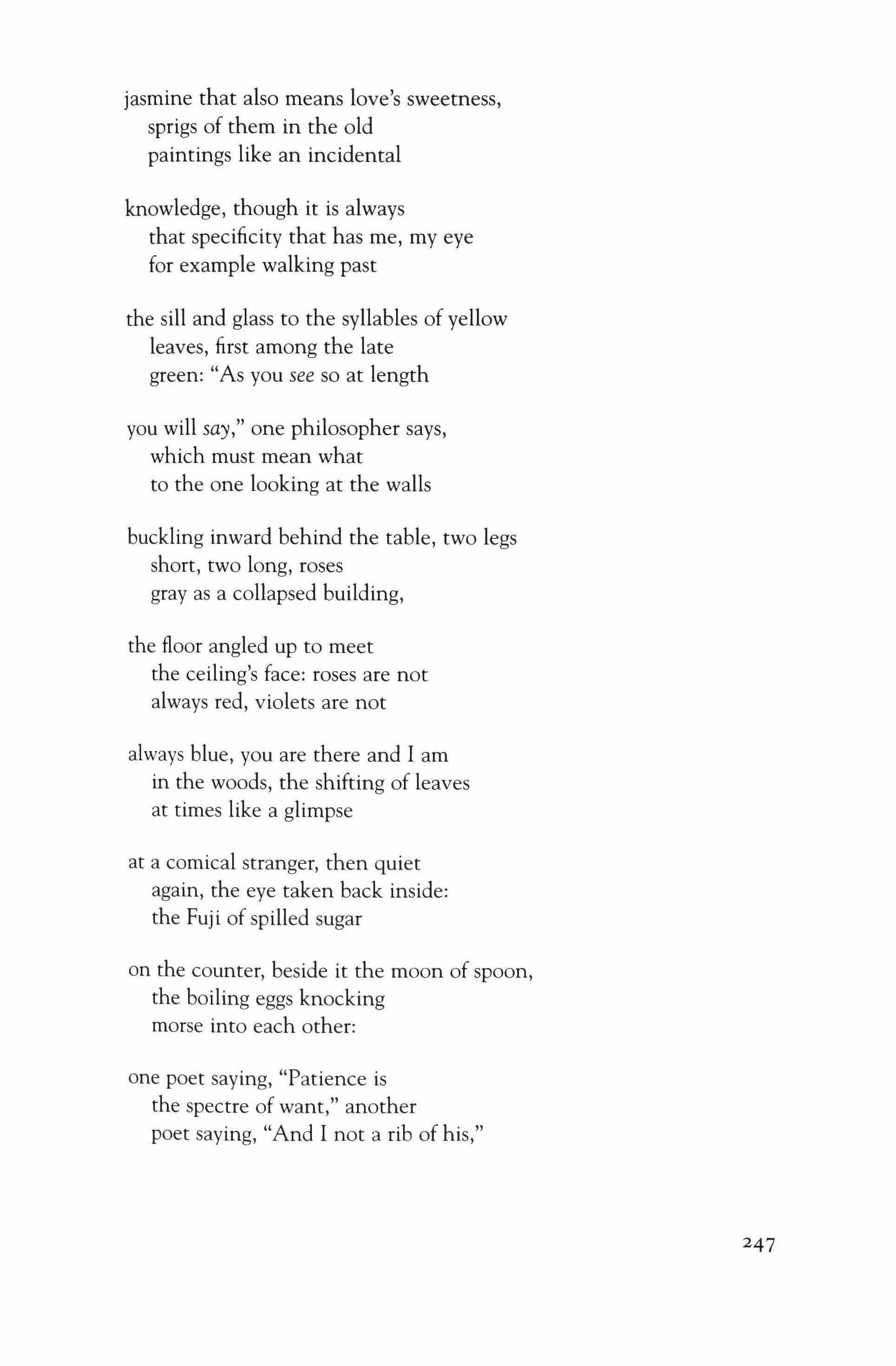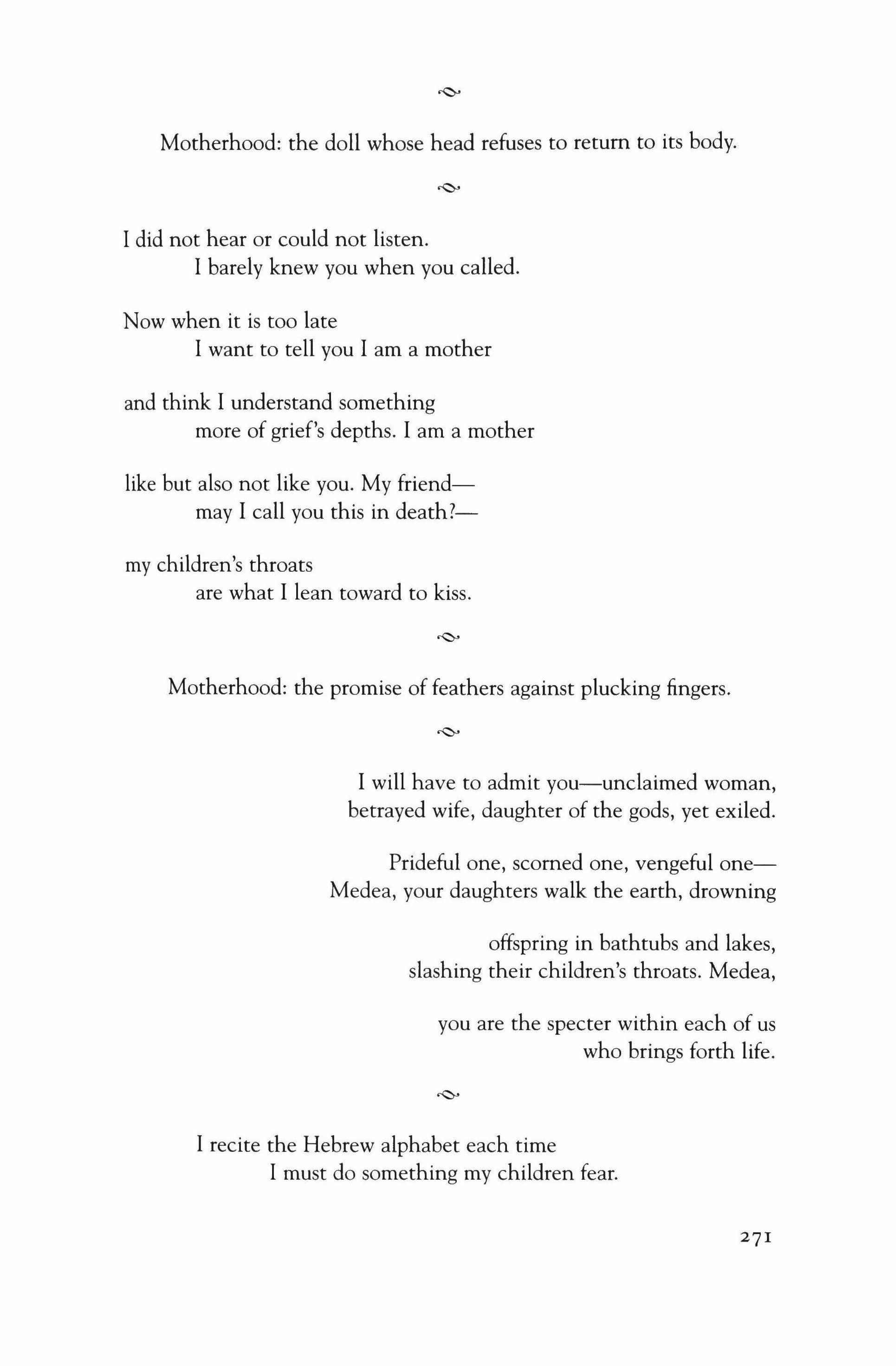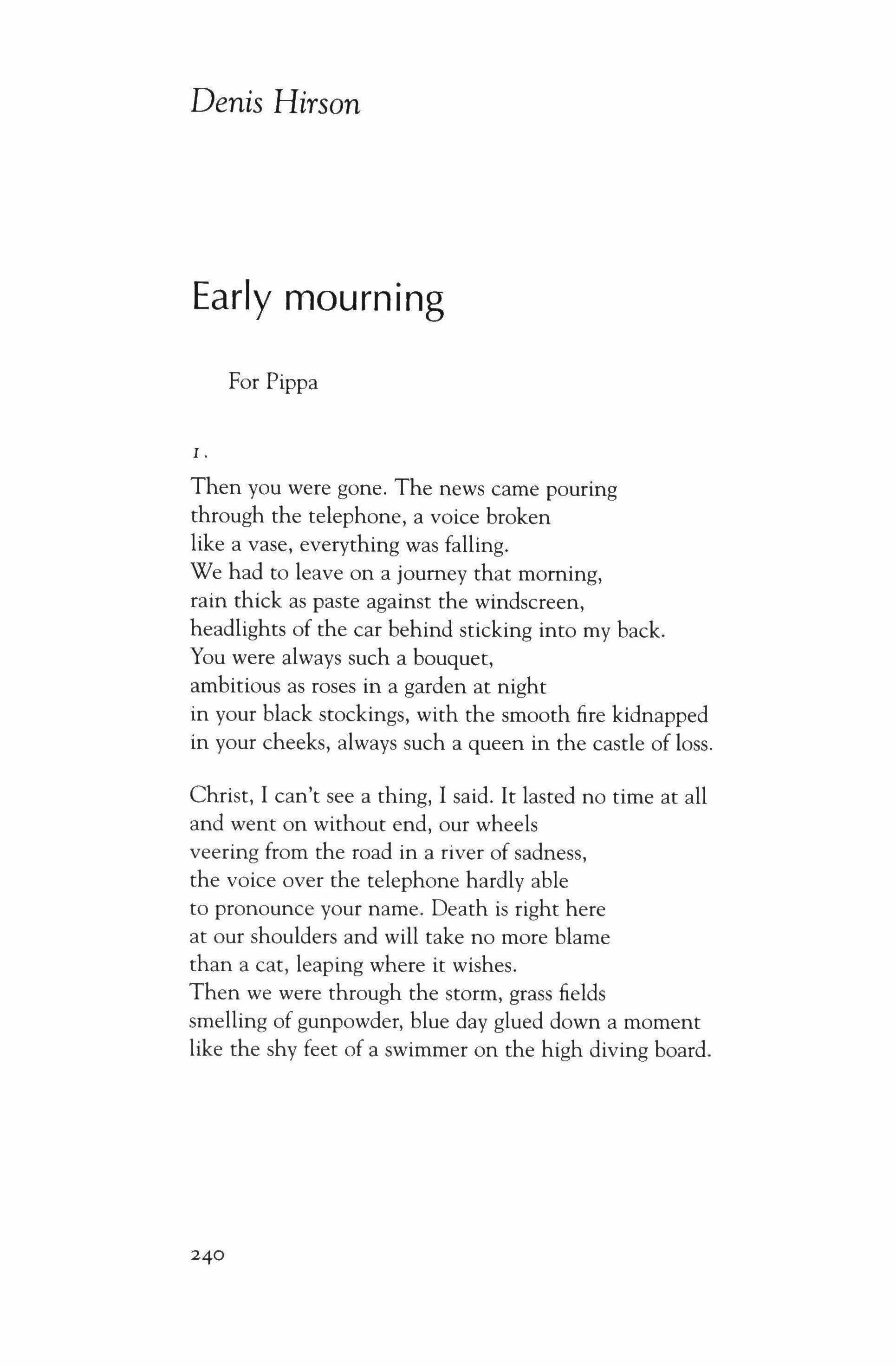 ton, 2006), and On Burning Ground: Thirty Years ofThinking About Poetry (University of Michigan Press, 2009). She is currently at work on a new collection of verse, of which "Aftermath" is the title poem and a prose work tentatively titled The Culinary Imagination. William Giraldi teaches at Boston University and is Senior Fiction Editor for the journal AGNI. His work has appeared recently in Georgia Review, Southern Review, Kenyon Review, and Antioch Review. laurence Goldstein is Professor English at the University of Michigan and the editor of Michigan Quarterly Review from 19772009. His fourth book of poems is A Room in California (Northwestern University Press/TriQuarterly Books, 2005). With Robert Chrisman, he coedited Robert Hayden: Essays on the Poetry (University of Michigan Press, 2005.). Debora Greger's most recent book of poems, Men, Women, and Ghosts, was published by Penguin in 2008. Jennifer Grotz is the author of Cusp (Houghton Mifflin, 2003). Brian Henry's most recent book is The Stripping Point (Counterpath, 2007). His translation of Tomas Salamua's Woods and Chalices appeared from Harcourt in 2008. Denis Hirson has published five books, all of them concerned with the memory of the apartheid years in South Africa, all of them crossing the frontier between prose and poetry: The House Next Door to Africa, I Remember King Kong (the Boxer), We Walk Straight So You Better Get Out the Way, White Scars, and Gardening in the Dark. White Scars was runner-up in 2007 for the major South African non-fiction prize, the Alan Paton Award. Hirson is