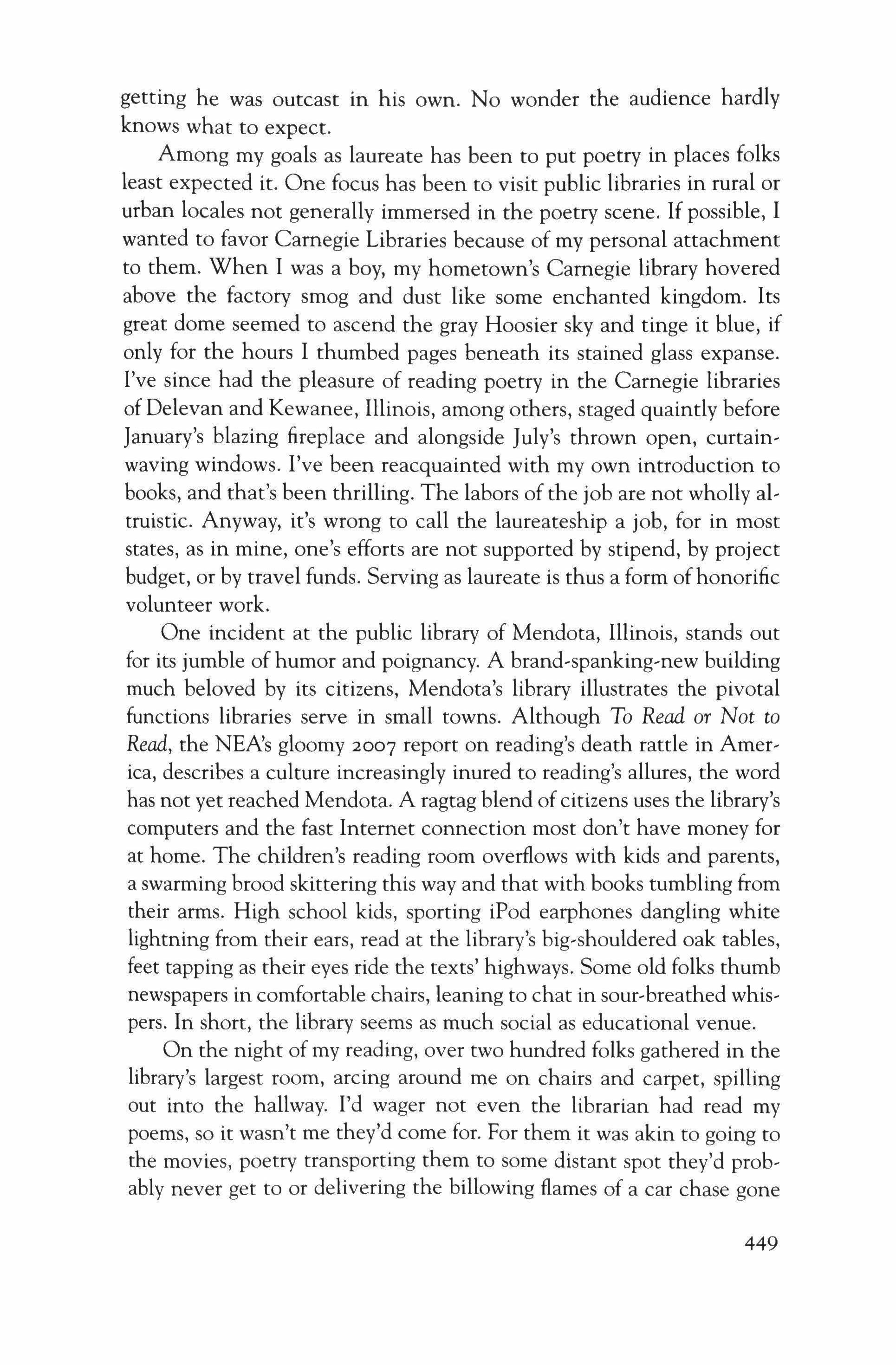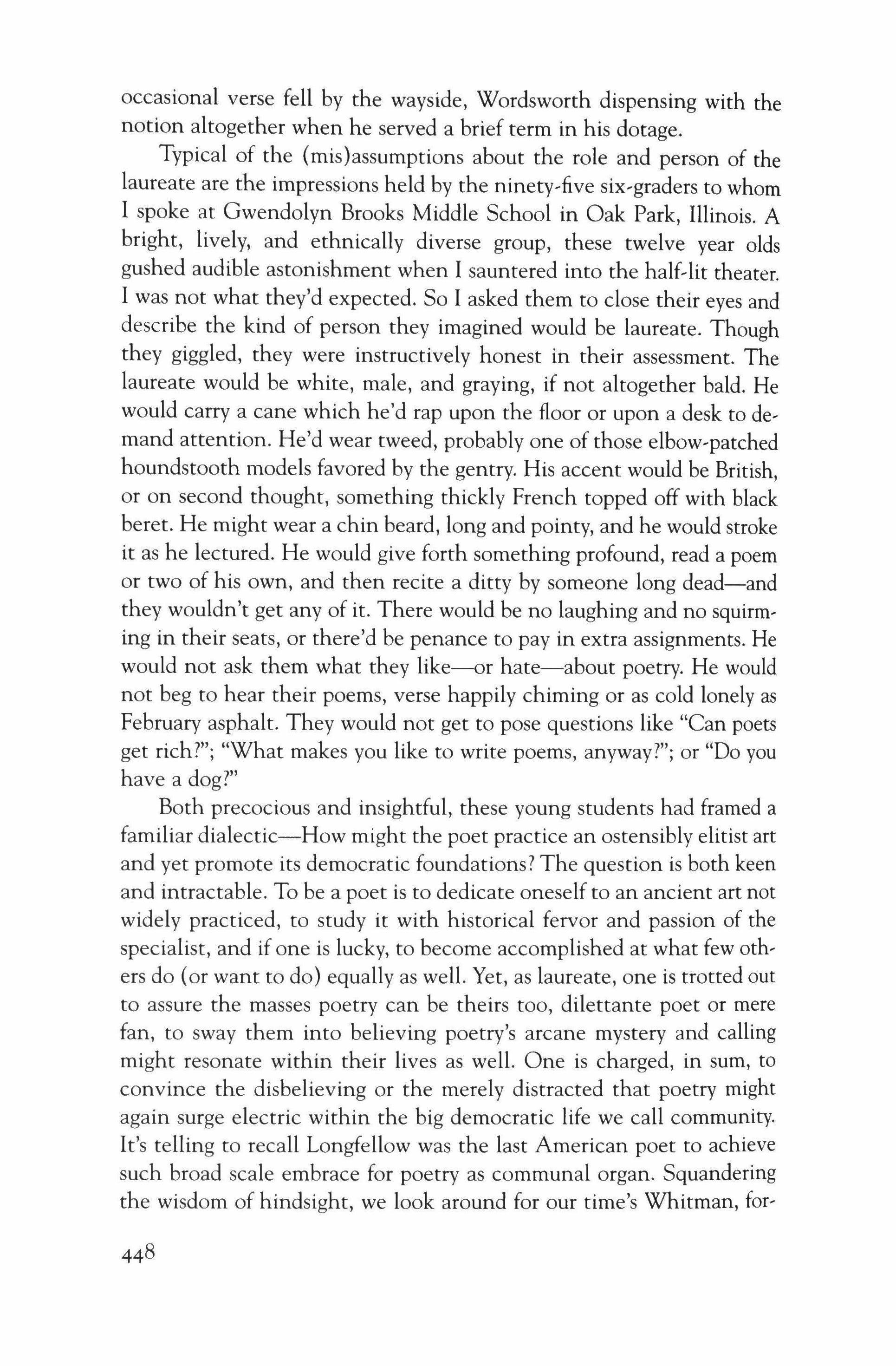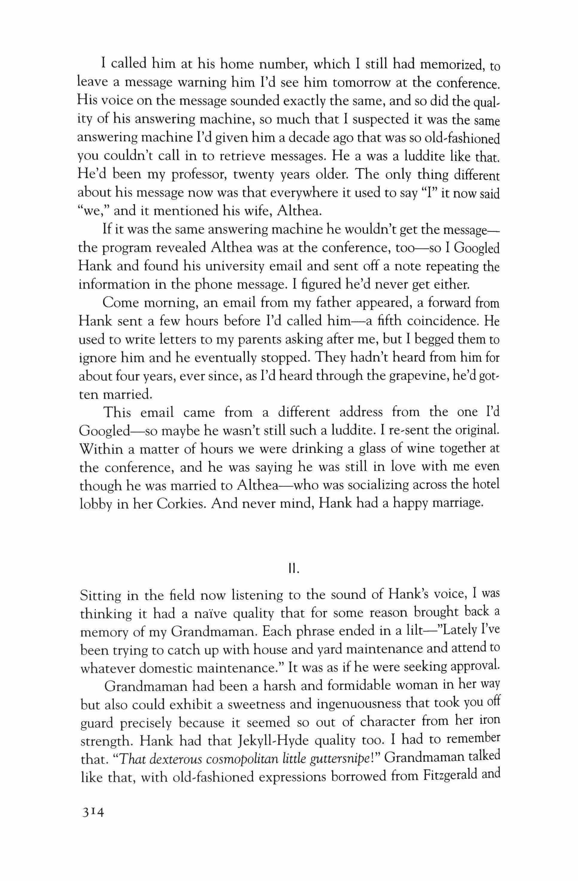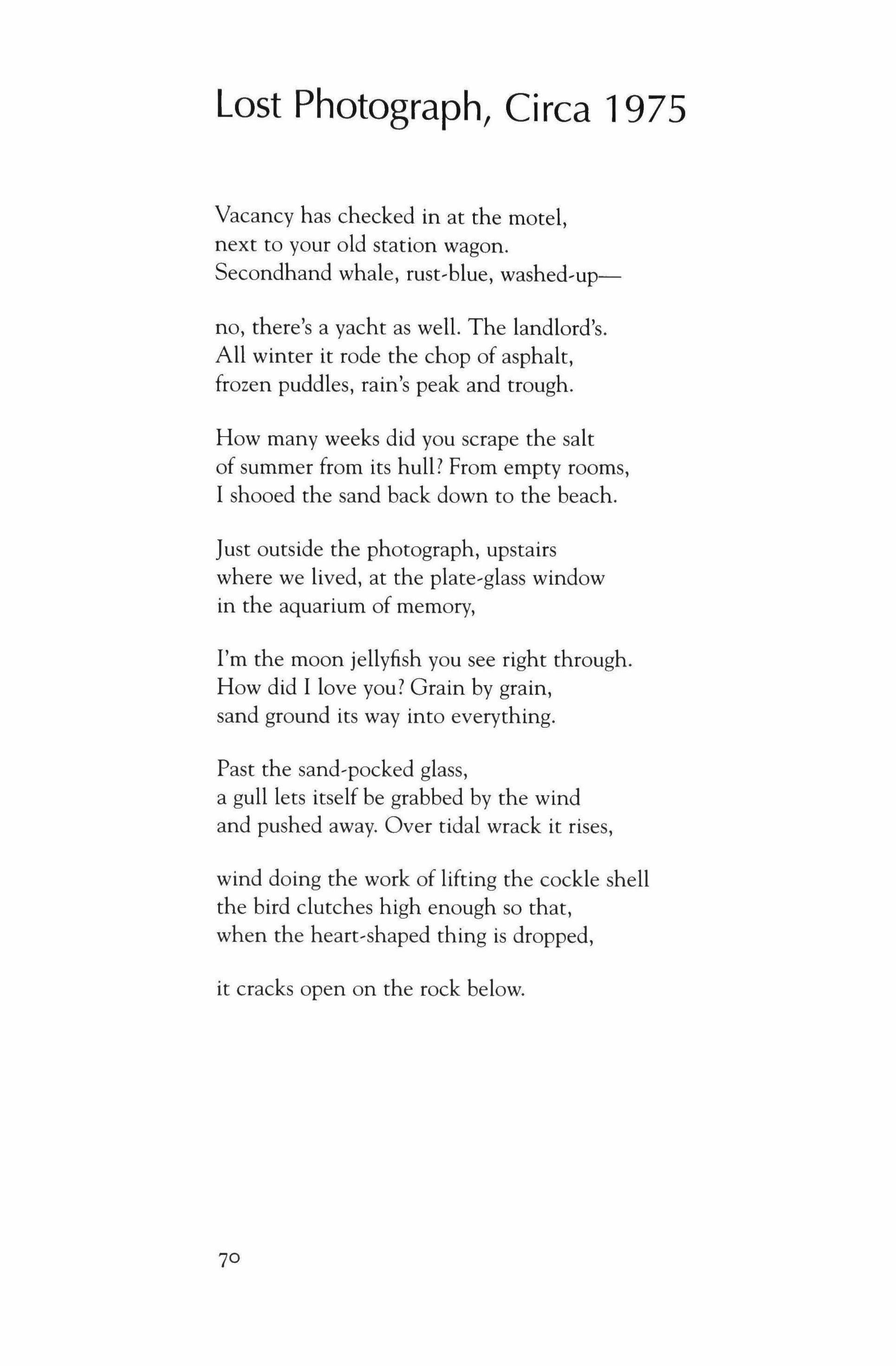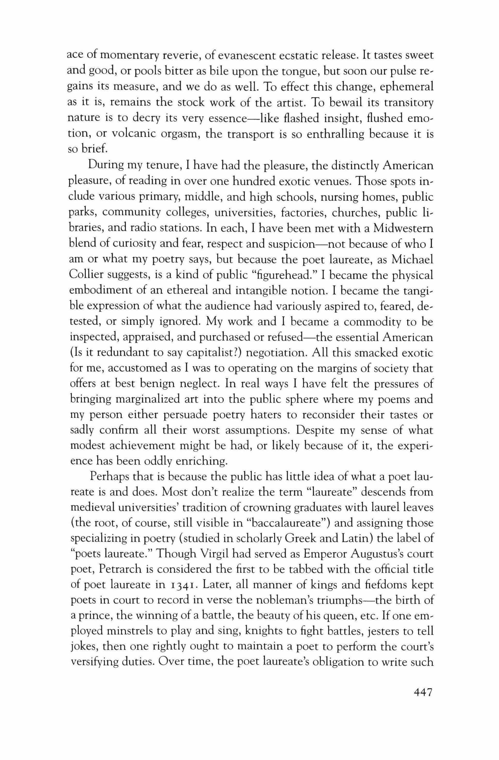 ton, 2006), and On Burning Ground: Thirty Years ofThinking About Poetry (University of Michigan Press, 2009). She is currently at work on a new collection of verse, of which "Aftermath" is the title poem and a prose work tentatively titled The Culinary Imagination. William Giraldi teaches at Boston University and is Senior Fiction Editor for the journal AGNI. His work has appeared recently in Georgia Review, Southern Review, Kenyon Review, and Antioch Review. laurence Goldstein is Professor English at the University of Michigan and the editor of Michigan Quarterly Review from 19772009. His fourth book of poems is A Room in California (Northwestern University Press/TriQuarterly Books, 2005). With Robert Chrisman, he coedited Robert Hayden: Essays on the Poetry (University of Michigan Press, 2005.). Debora Greger's most recent book of poems, Men, Women, and Ghosts, was published by Penguin in 2008. Jennifer Grotz is the author of Cusp (Houghton Mifflin, 2003). Brian Henry's most recent book is The Stripping Point (Counterpath, 2007). His translation of Tomas Salamua's Woods and Chalices appeared from Harcourt in 2008. Denis Hirson has published five books, all of them concerned with the memory of the apartheid years in South Africa, all of them crossing the frontier between prose and poetry: The House Next Door to Africa, I Remember King Kong (the Boxer), We Walk Straight So You Better Get Out the Way, White Scars, and Gardening in the Dark. White Scars was runner-up in 2007 for the major South African non-fiction prize, the Alan Paton Award. Hirson is