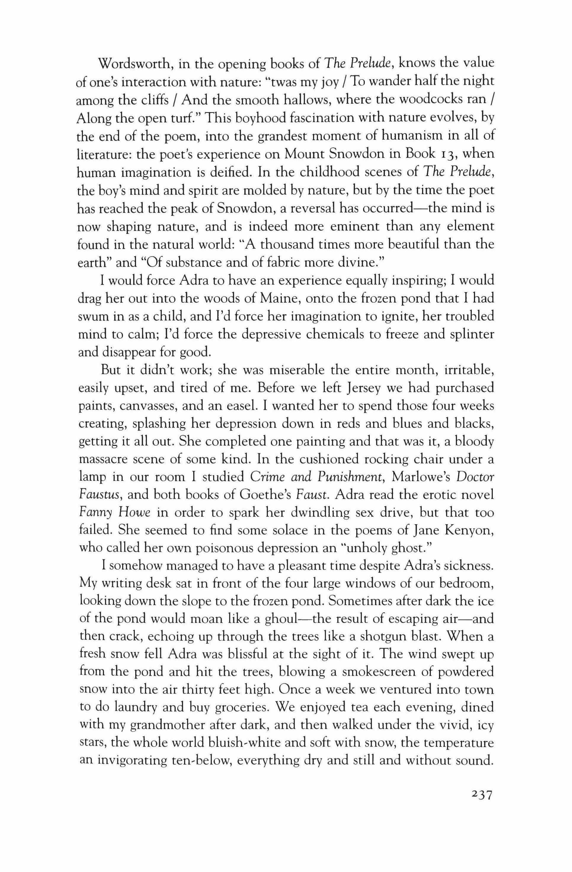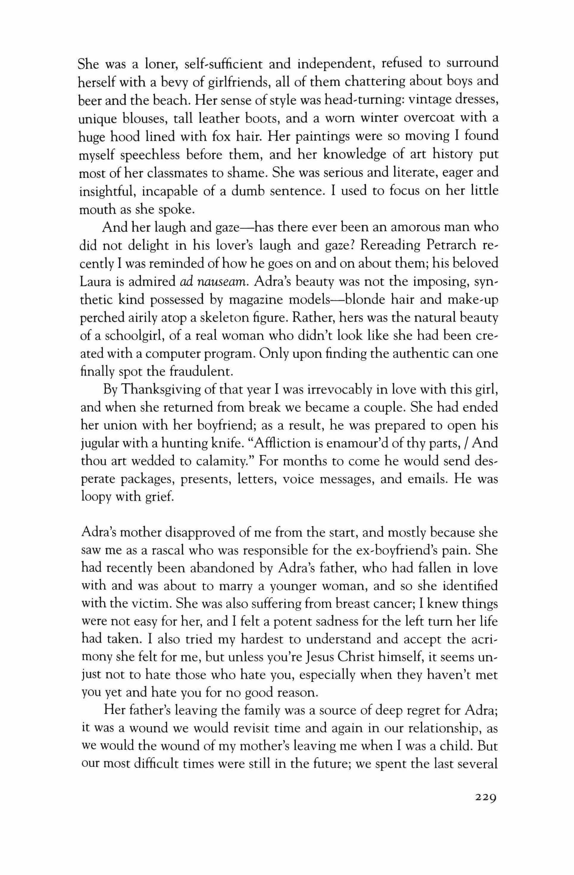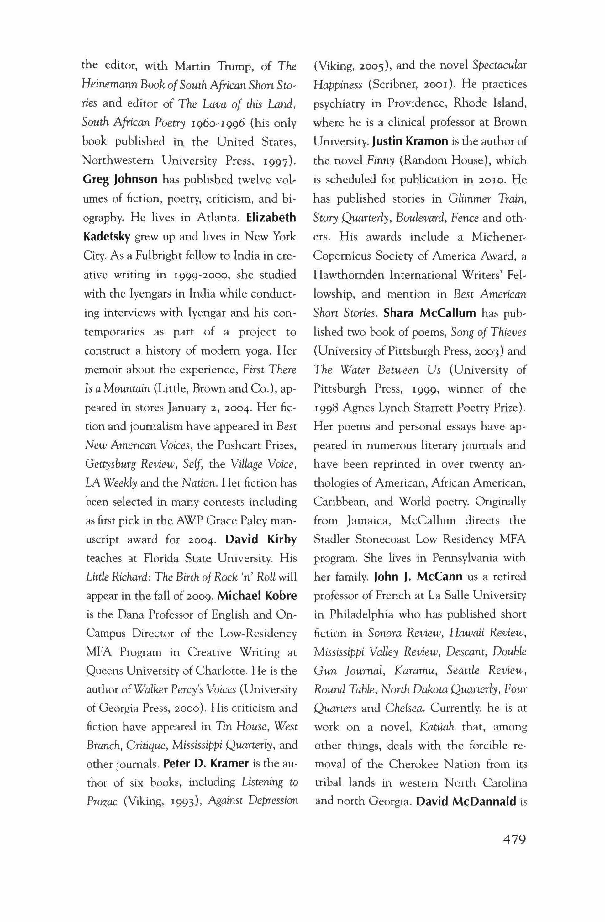 Greg Johnson has published twelve volumes of fiction, poetry, criticism, and biography. He lives in Atlanta. Elizabeth Kadetsky grew up and lives in New York City. As a Fulbright fellow to India in creative writing in 1999-2000, she studied with the Iyengars in India while conducting interviews with Iyengar and his contemporaries as part of a project to construct a history of modern yoga. Her memoir about the experience, First There Is a Mountain (Little, Brown and Co.), appeared in stores January 2, 2004. Her fiction and journalism have appeared in Best New American Voices, the Pushcart Prizes, Gettysburg Review, Self, the Village Voice, LA Weekly and the Nation. Her fiction has been selected in many contests including as first pick in the AWP Grace Paley manuscript award for 2004. David Kirby teaches at Florida State University. His Uttle Richard: The Birth ofRock 'n' RoU will appear in the fall of 2009. Michael Kobre is the Dana Professor of English and OnCampus Director of the Low-Residency MFA Program in Creative Writing at Queens University of Charlotte. He is the author of Walker Percy's Voices (University of Georgia Press, 2000). His criticism and fiction have appeared in Tin House, West Branch, Critique, MississiPPi Quarterly, and other journals. Peter D. Kramer is the author of six books, including Listening to Prozac (Viking, 1993), Against Depression