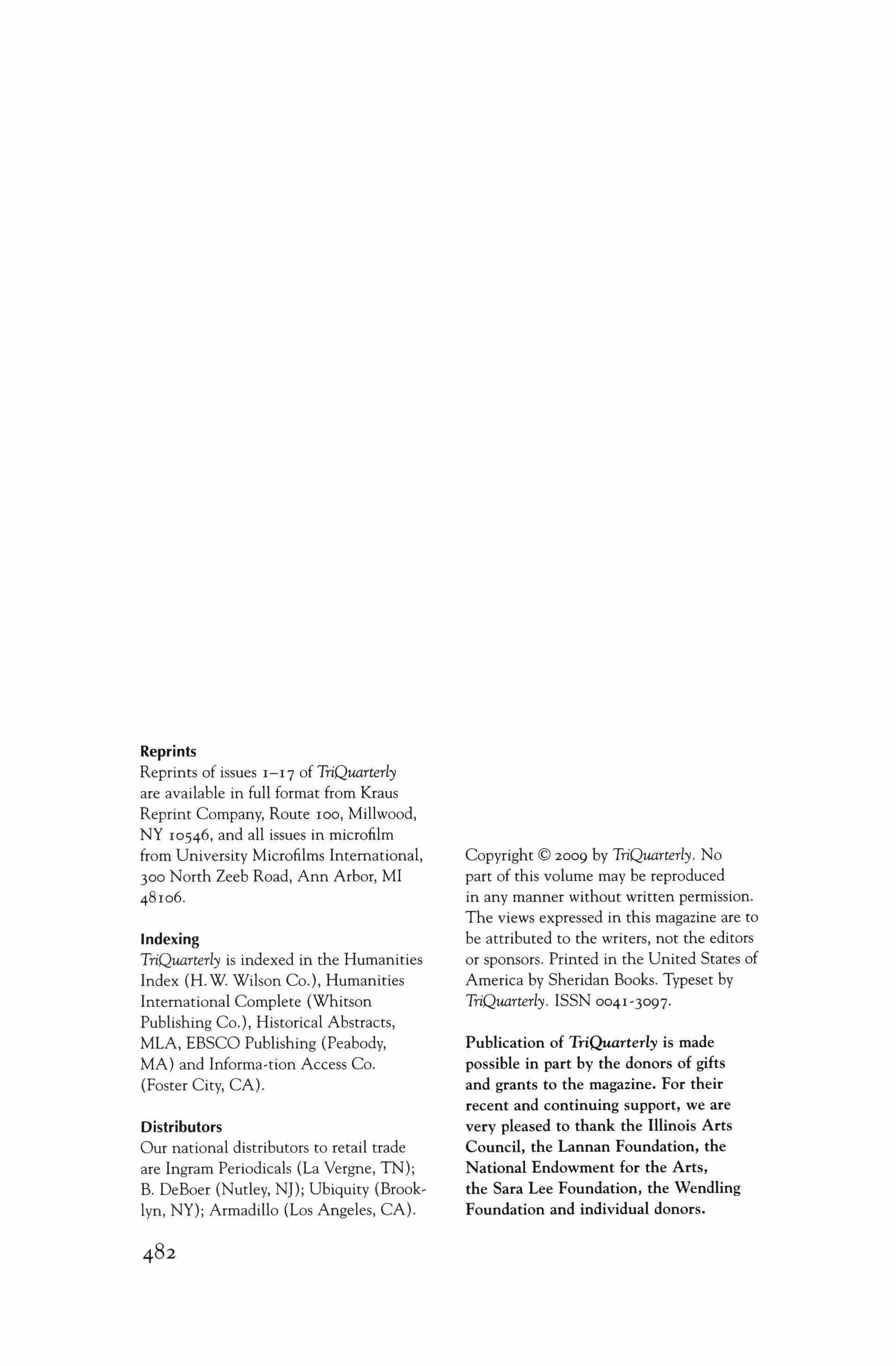 Copyright © 2009 by TriQuarterly. No part of this volume may be reproduced in any manner without written permission. The views expressed in this magazine are to be attributed to the writers, not the editors or sponsors. Printed in the United States of America by Sheridan Books. Typeset by TriQuarterly. ISSN 0041-3097.