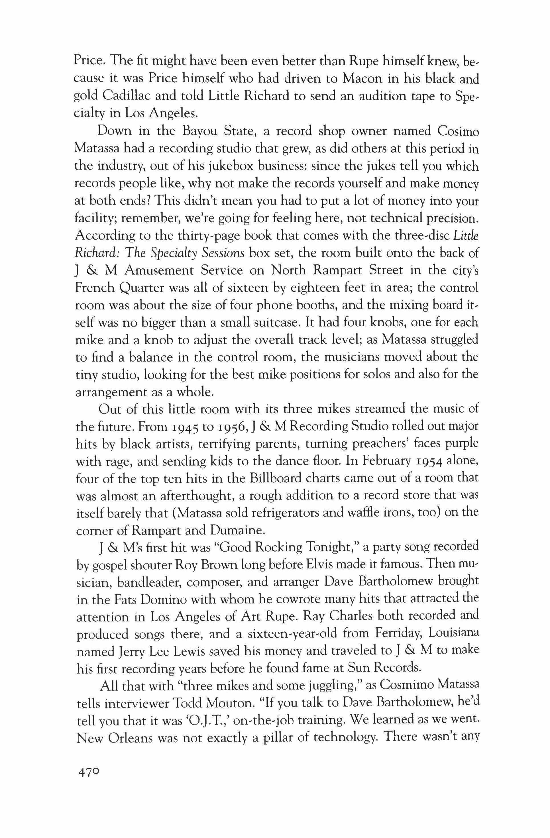 Down in the Bayou State, a record shop owner named Cosimo Matassa had a recording studio that grew, as did others at this period in the industry, out of his jukebox business: since the jukes tell you which records people like, why not make the records yourself and make money at both ends? This didn't mean you had to put a lot of money into your facility; remember, we're going for feeling here, not technical precision. According to the thirty-page book that comes with the three-disc Little Richard: The Specialty Sessions box set, the room built onto the back of J & M Amusement Service on North Rampart Street in the city's French Quarter was all of sixteen by eighteen feet in area; the control room was about the size of four phone booths, and the mixing board itself was no bigger than a small suitcase. It had four knobs, one for each mike and a knob to adjust the overall track level; as Matassa struggled to find a balance in the control room, the musicians moved about the tiny studio, looking for the best mike positions for solos and also for the arrangement as a whole.