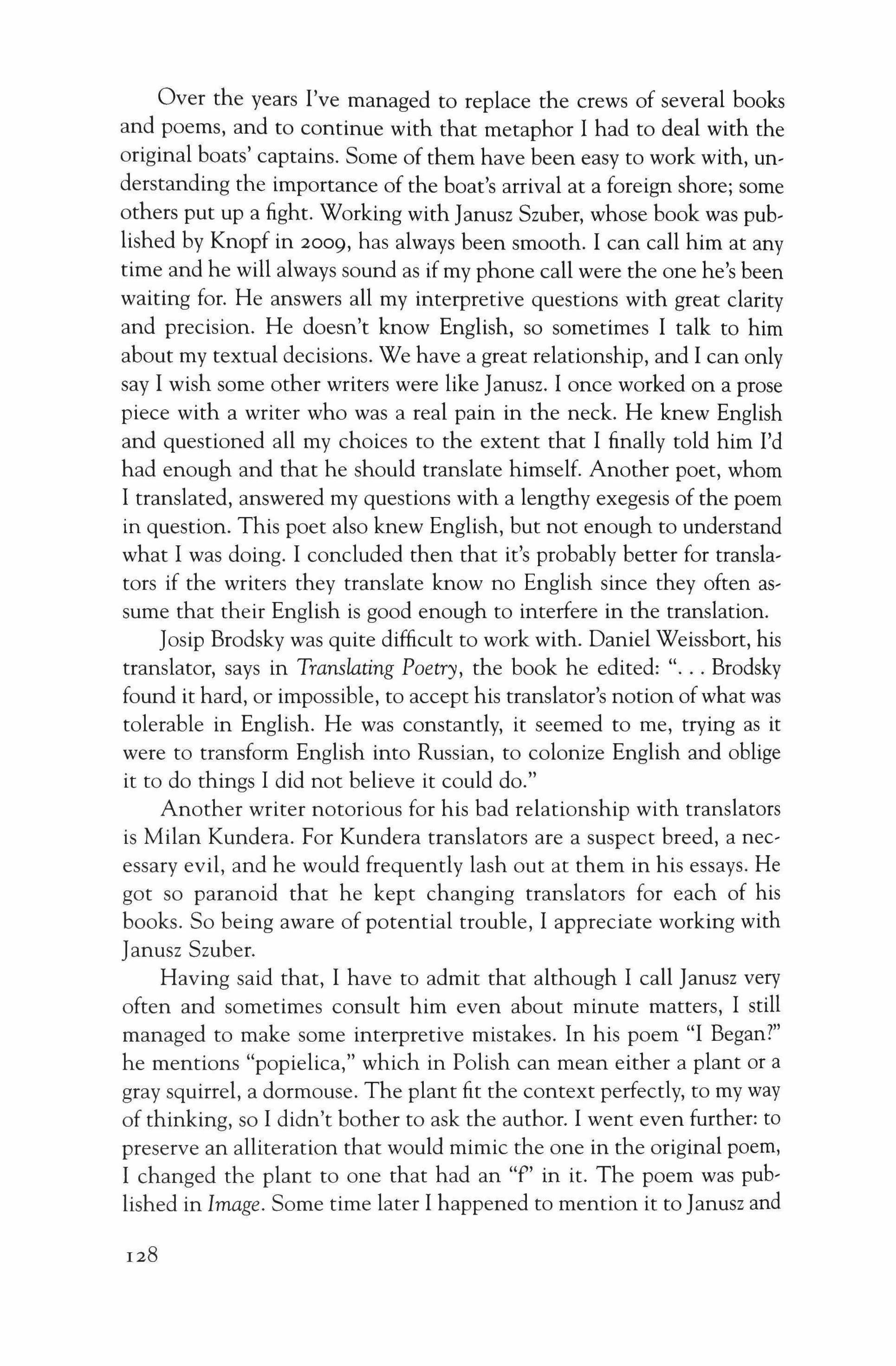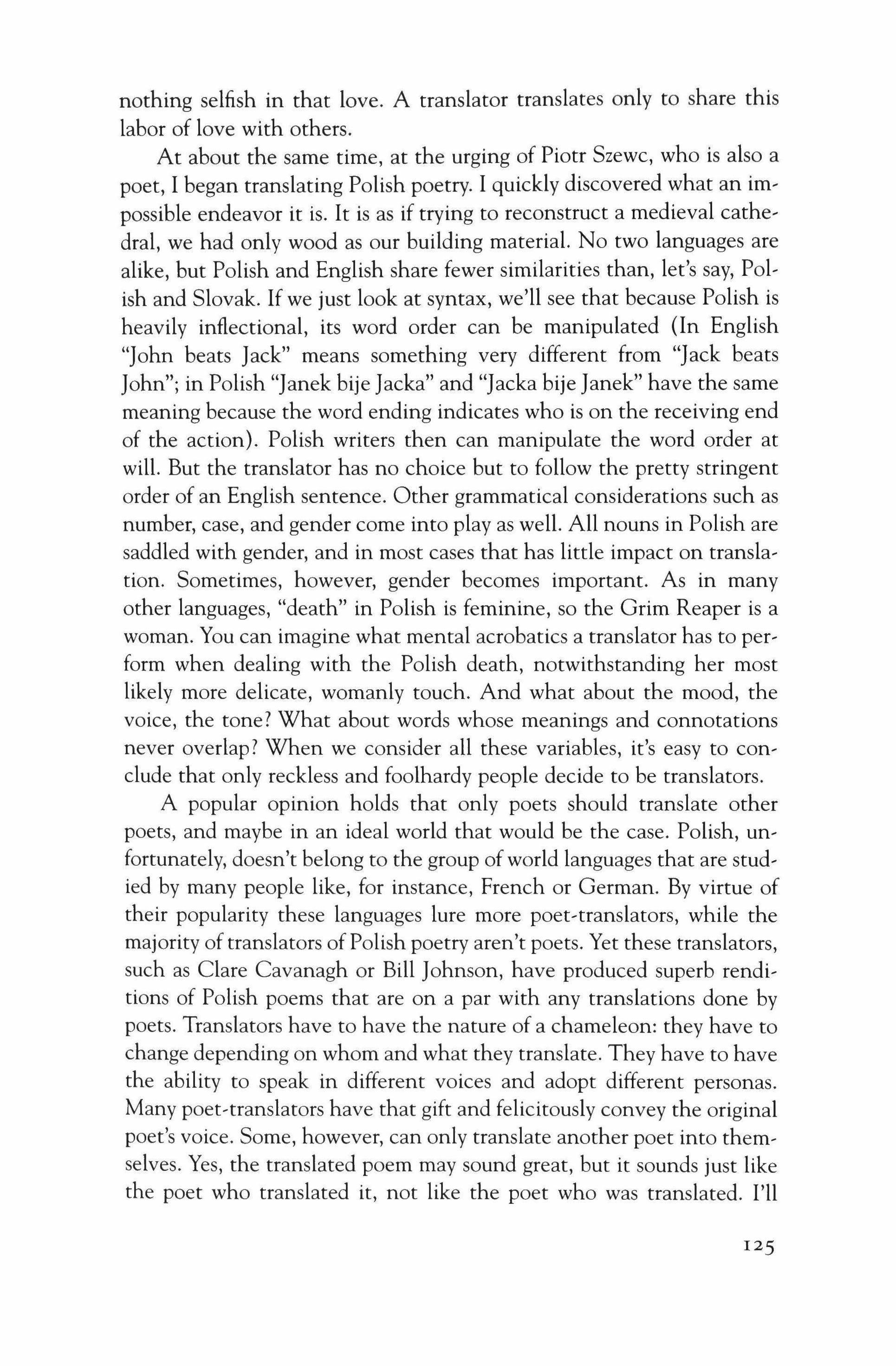 Warrior Review. He is the co-director of the documentary film Avid Land, (2007). He is originally from Oregon and now lives in San Francisco. Tom Wayman's latest collection of poems, his seventeenth, is High Speed Through Shoaling Water (Harbour, 2007). Two collections of his short fiction also appeared in 2007, Boundary Country (Eastern Washington UP, short stories) and A Vain Thing (Turnstone, novellas). His newest book is a critical essay, Songs Without Price: The Music ofPoetry in a Discordant World (University of Vancouver Island, 2008). He lives in the Selkirk Mountains of southeastern B.C., and teaches at the University of Calgary. Ewa Hryniewicz-Yarbrough's poetry translations have appeared in numerous journals, including the New Yorker, Paris Review, Ploughshares, Poetry and TriQuarterly. She has also translated a book of poems by the Polish poet Janusz Szuber (Knopf, 2009) and two novels, Annihilation (Dalkey Archive, 1993) and Rat (Arcade, 1994). David Yezzi is the author of The Hidden Model (2003) and Azores (2008, a Slate best book of the year) and the editor of the Swallow Anthology of New American Poets (2009). He is executive editor of the New Criticism.