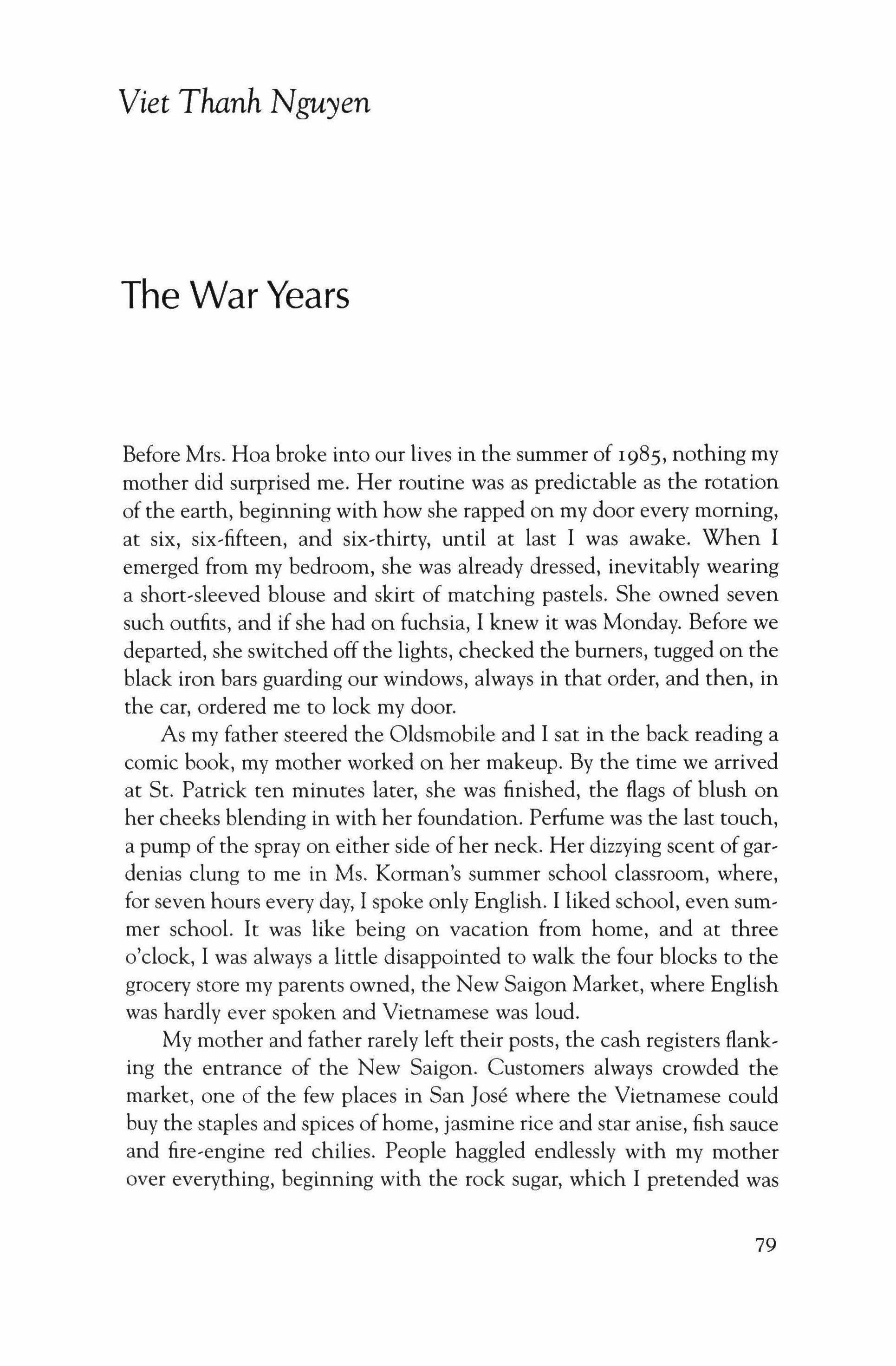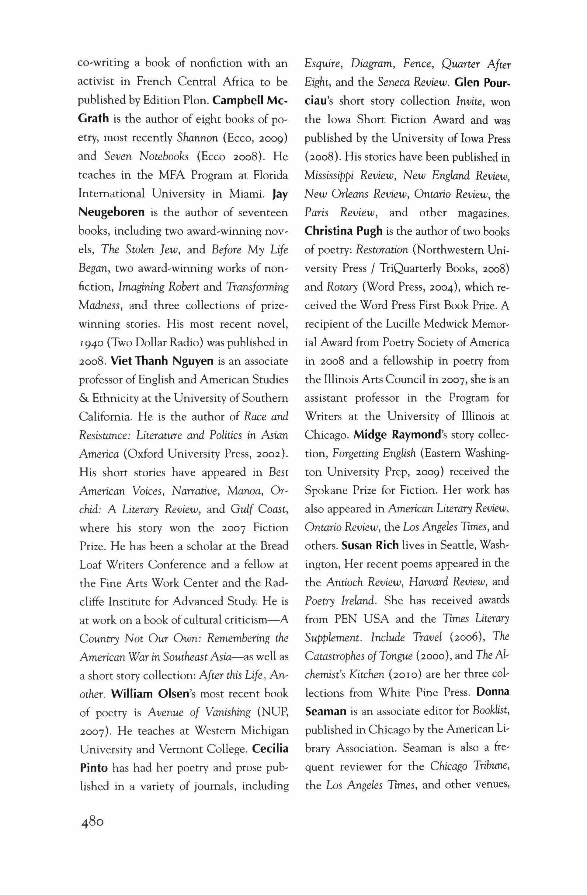 co-writing a book of nonfiction with an activist in French Central Africa to be published by Edition Pion. Campbell McGrath is the author of eight books of poetry, most recently Shannon (Ecco, 2009) and Seven Notebooks (Ecco 2008). He teaches in the MFA Program at Florida International University in Miami. Jay Neugeboren is the author of seventeen books, including two award-winning novels, The Stolen Jew, and Before My Life Began, two award-winning works of nonfiction, Imagining Robert and Transforming Madness, and three collections of prizewinning stories. His most recent novel, I 940 (Two Dollar Radio) was published in 2008. Viet Thanh Nguyen is an associate professor of English and American Studies & Ethnicity at the University of Southern California. He is the author of Race and Resistance: Literature and Politics in Asian America (Oxford University Press, 2002). His short stories have appeared in Best American Voices, Narrative, Manoa, Orchid: A Literary Review, and Gulf Coast, where his story won the 2007 Fiction Prize. He has been a scholar at the Bread Loaf Writers Conference and a fellow at the Fine Arts Work Center and the Radcliffe Institute for Advanced Study. He is at work on a book ofcultural criticism-A Country Not Our Own: Remembering the American War in Southeast Asia-as well as a short story collection: After this Life, Another. William Olsen's most recent book of poetry is Avenue of Vanishing (NUP, 2007). He teaches at Western Michigan University and Vermont College. Cecilia Pinto has had her poetry and prose published in a variety of journals, including