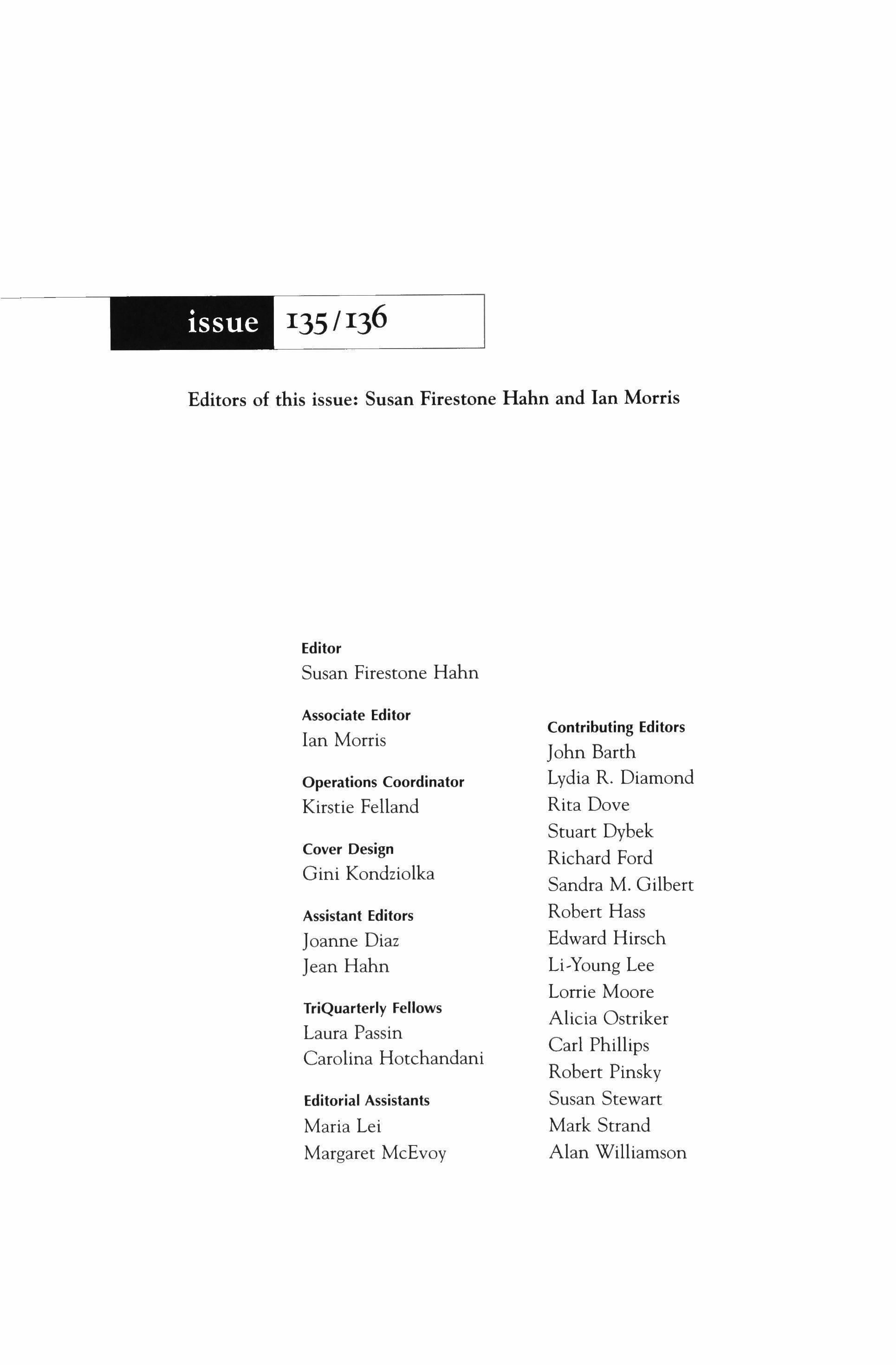 Publication of TriQuarterly is made possible in part by the donors of gifts and grants to the magazine. For their recent and continuing support, we are very pleased to thank the Illinois Arts Council, the Lannan Foundation, the National Endowment for the Arts, the Sara Lee Foundation, the Wendling Foundation and individual donors.