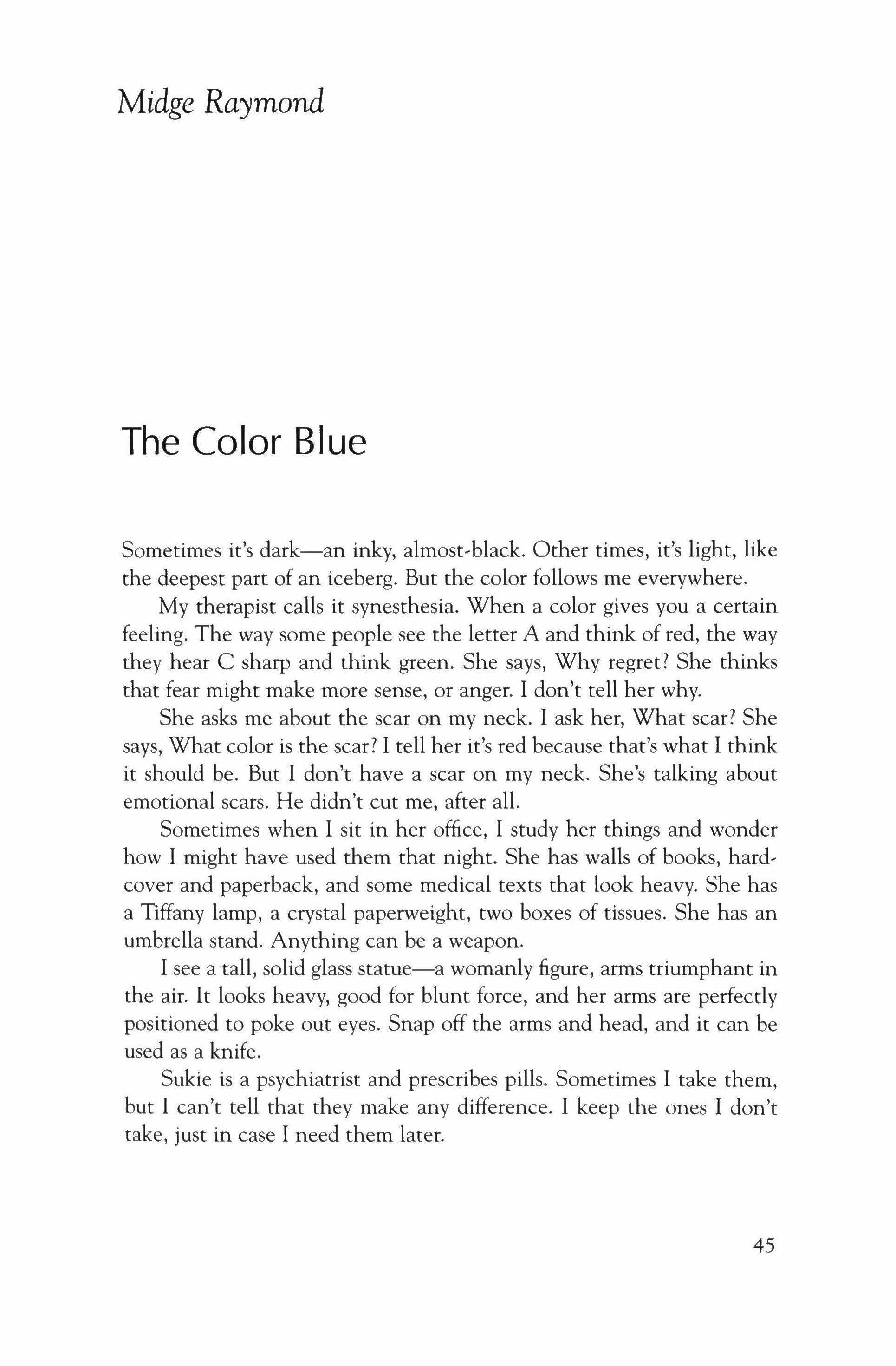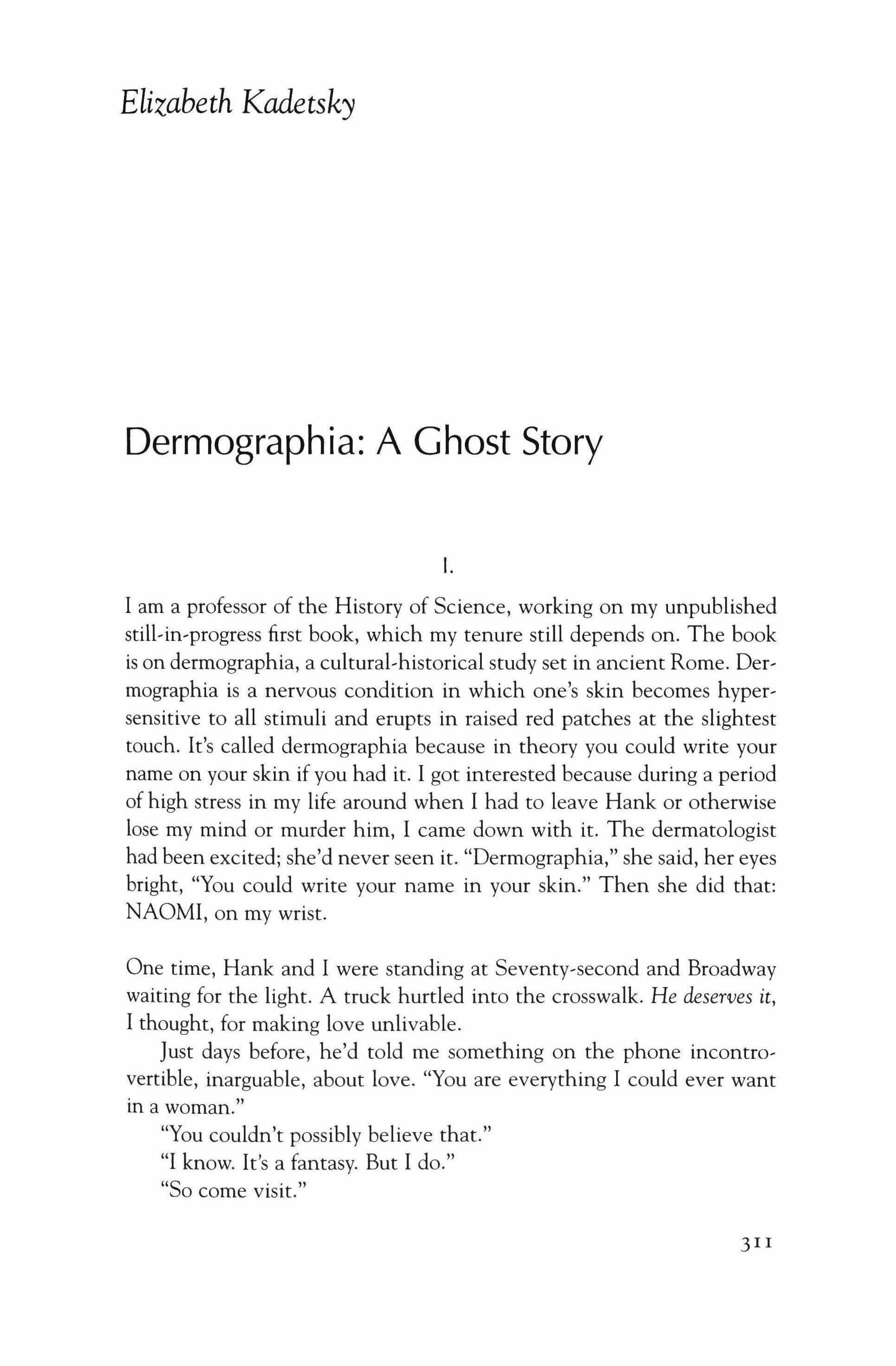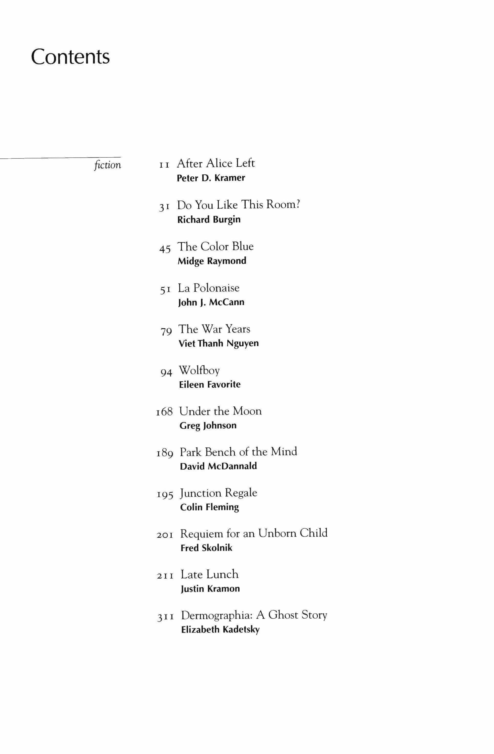 D. Kramer 31 Do You Like This Room? Richard Burgin 45 The Color Blue Midge Raymond 51 La Polonaise John J. McCann 79 The War Years Viet Thanh Nguyen 94 Wolfboy Eileen Favorite 168 Under the Moon Greg Johnson 189 Park Bench of the Mind David McDannald 195 Junction Regale Colin Fleming 201 Requiem for an Unborn Child Fred Skolnik 211 Late Lunch Justin Kramon 311 Dermographia: A Ghost Story Elizabeth Kadetsky