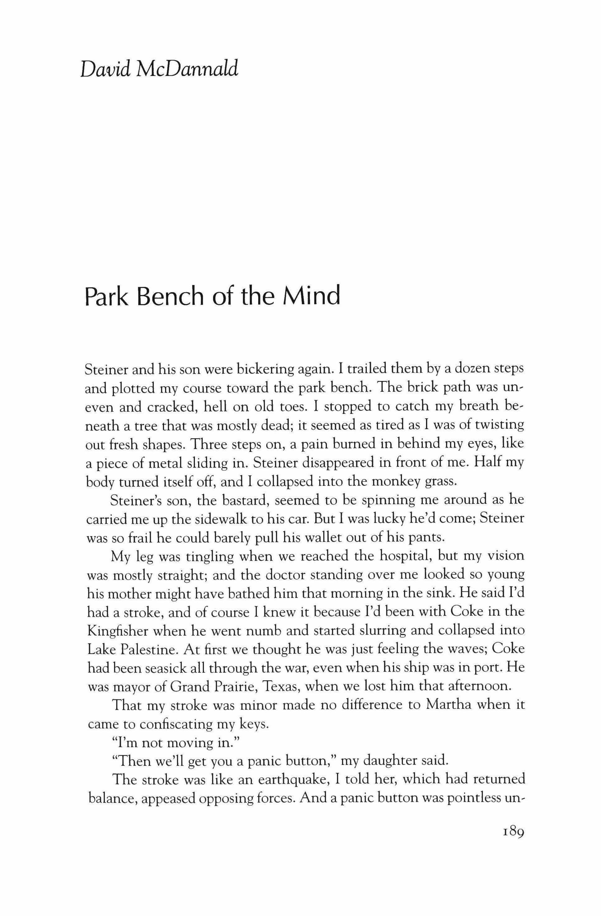 (Viking, 2005), and the novel Spectacular Happiness (Scribner, 2001). He practices psychiatry in Providence, Rhode Island, where he is a clinical professor at Brown University. Justin Kramon is the author of the novel Finny (Random House), which is scheduled for publication in 2010. He has published stories in Glimmer Train, Story Quarterly, Boulevard, Fence and others. His awards include a MichenerCopernicus Society of America Award, a Hawthomden International Writers' Fellowship, and mention in Best American Short Stories. Shara McCallum has published two book of poems, Song of Thieves (University of Pittsburgh Press, 2003) and The Water Between Us (University of Pittsburgh Press, 1999, winner of the 1998 Agnes Lynch Starrett Poetry Prize). Her poems and personal essays have appeared in numerous literary journals and have been reprinted in over twenty anthologies of American, African American, Caribbean, and World poetry. Originally from Jamaica, McCallum directs the Stadler Stonecoast Low Residency MFA program. She lives in Pennsylvania with her family. John J. McCann us a retired professor of French at La Salle University in Philadelphia who has published short fiction in Sonora Review, Hawaii Review, Mississippi Valley Review, Descant, Double Gun Journal, Karamu, Seattle Review, Round Table, North Dakota Quarterly, Four Quarters and Chelsea. Currently, he is at work on a novel, Katu.a.h that, among other things, deals with the forcible removal of the Cherokee Nation from its tribal lands in western North Carolina and north Georgia. David McDannald is