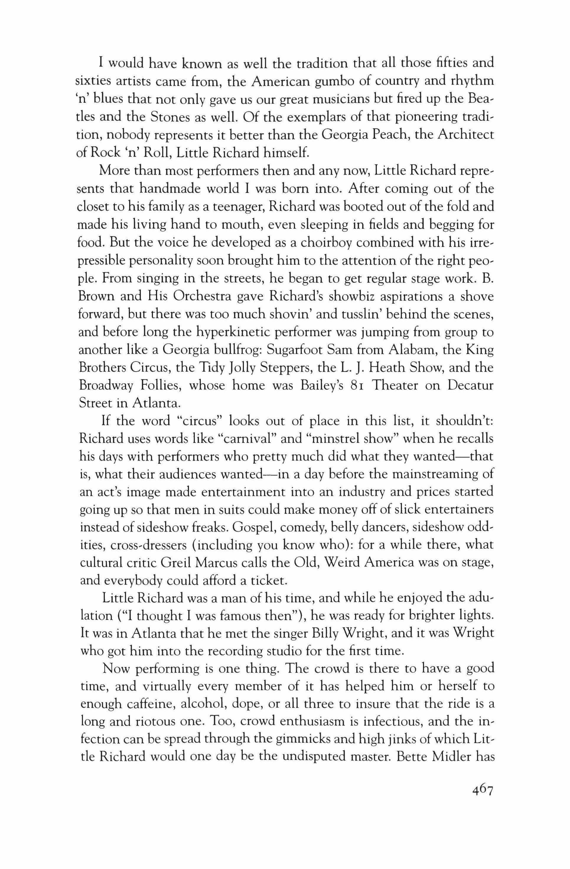 And as I gave this essay its final haircut, I heard a live performance by a duo called the Two Man Gentleman Band, a couple of traveling dweebs who play the bass and the banjo and whose biggest hit is a tribute to our fattest president called "William Howard Taft." They sang and sounded as though they had stepped right out of one of those circuses the young Little Richard performed in, and when they finished, they stepped over to the merch table to hawk, not patent medicine, but cheap-looking T-shirts and CDs in cardboard covers.
